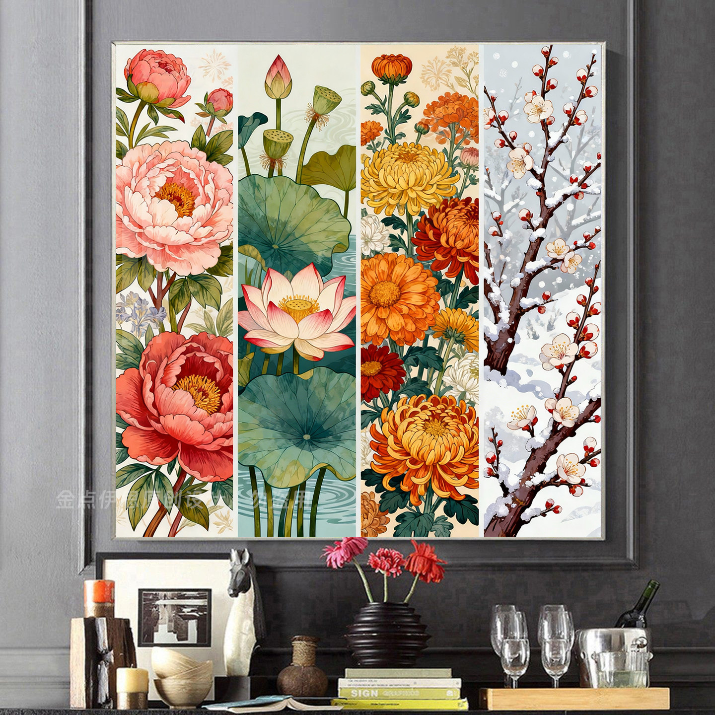 十字绣春夏秋冬竖版牡丹荷花手工客厅家用2025绣新款刺绣自己绣