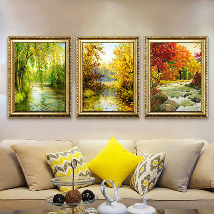 满钻钻石画十字绣春夏秋冬欧式风景山水画新款满钻客厅三联钻石绣