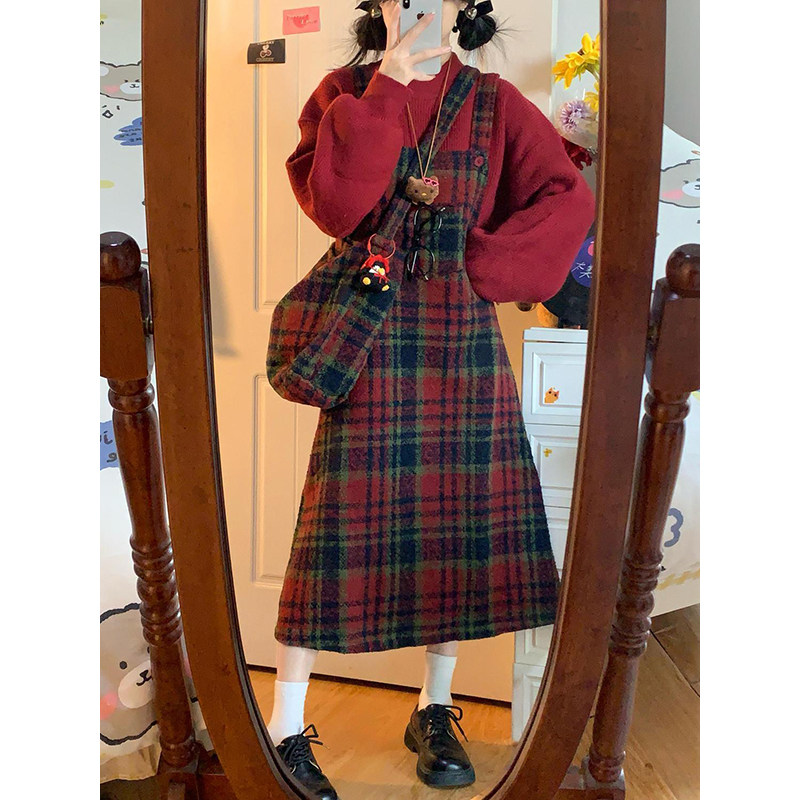 法式圣诞甜妹风复古撞色格子背带毛呢连衣裙+红色针织衫两件套装