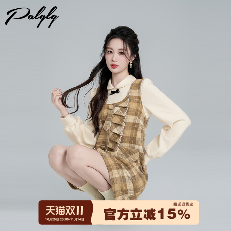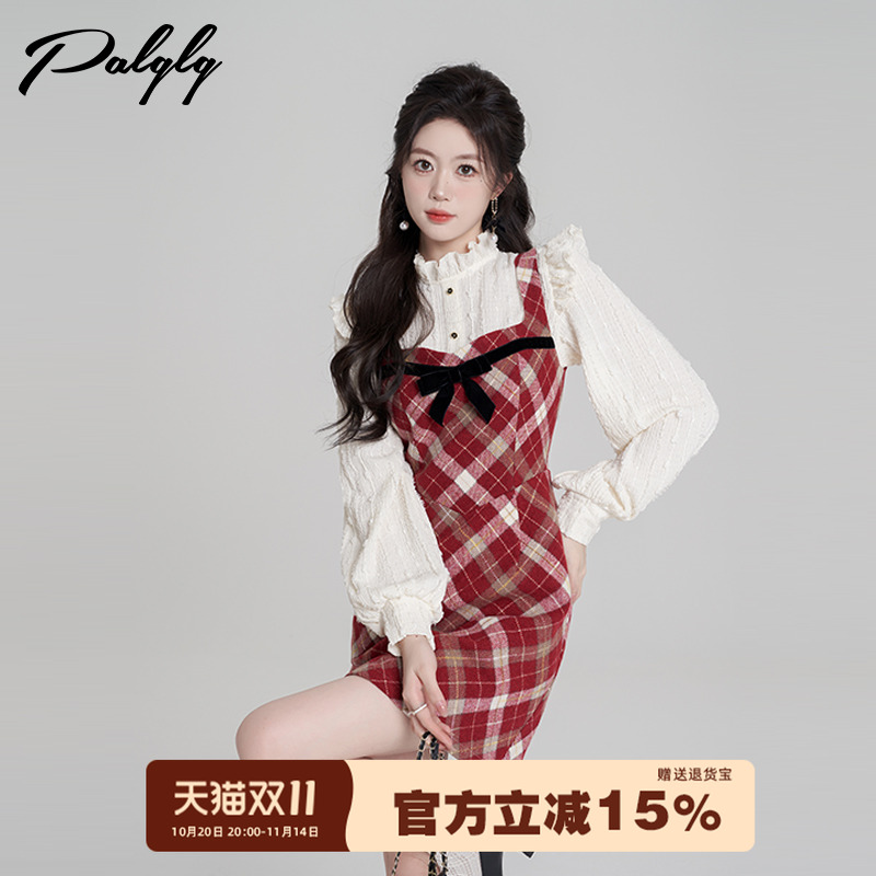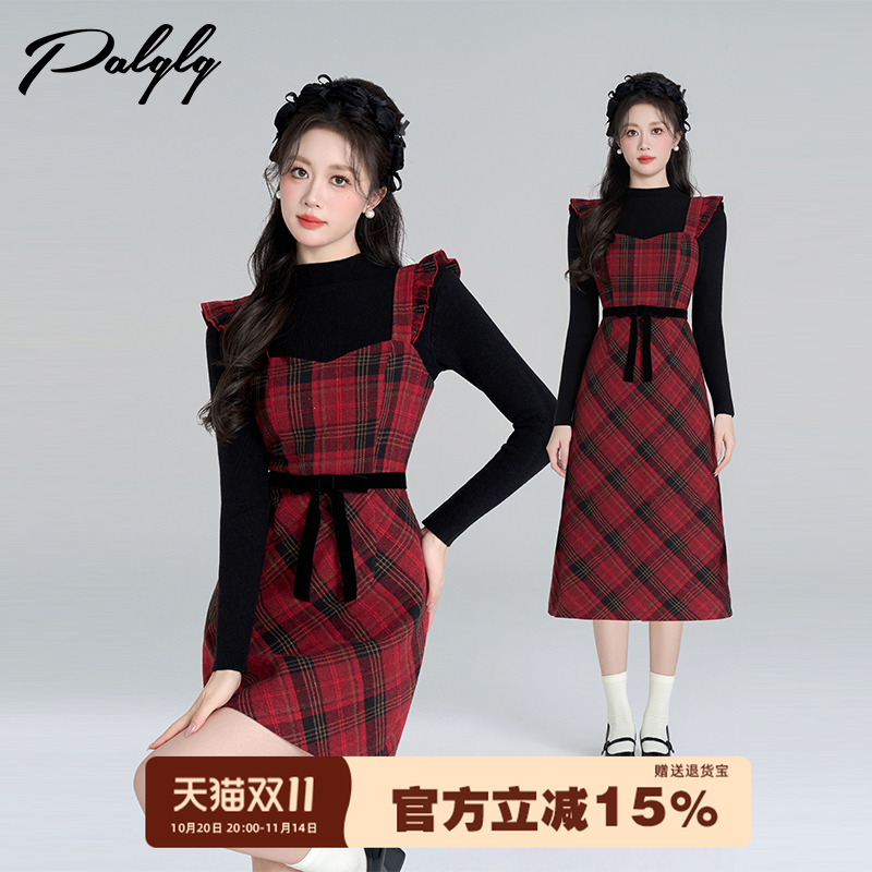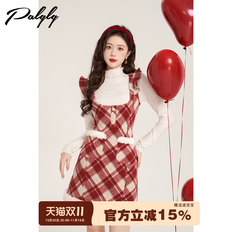 菲梦伊贵气名媛时尚套装女秋季高领打底t恤格子背带连衣裙两件套