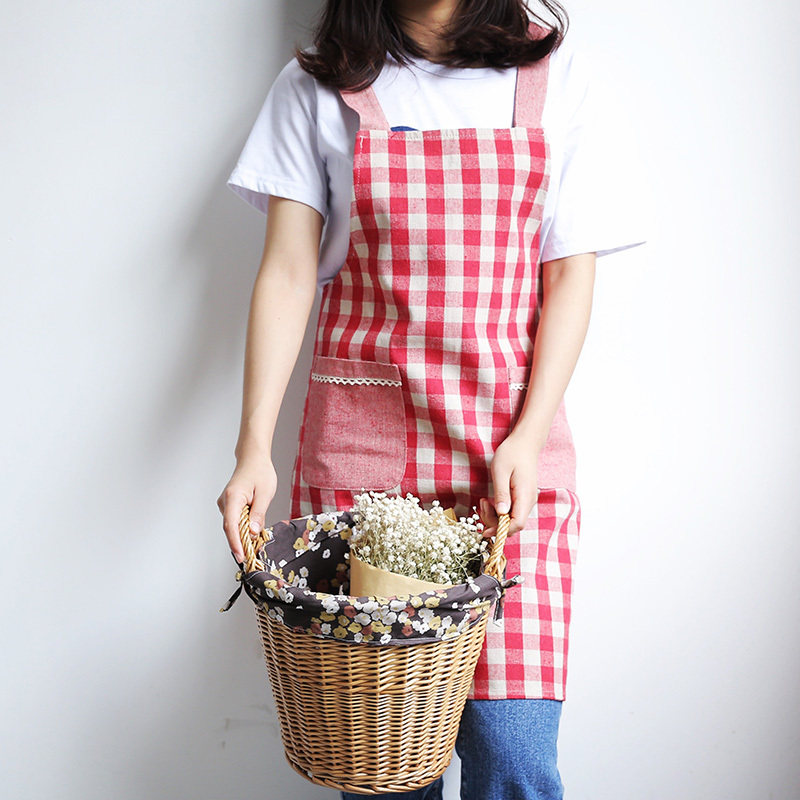 日式棉麻围裙厨房家用格子简约时尚防污背带夏日轻薄无袖罩衣上班