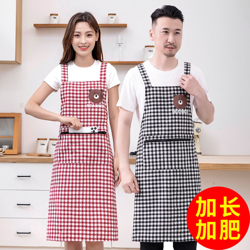 卡通时尚格子加长加肥棉布围裙家用厨房上班防污透气背带围腰男女