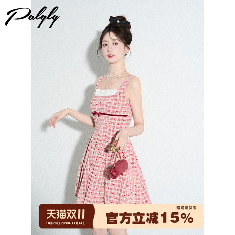 小香风甜美粉色格子背带连衣裙女夏季拼接蕾丝方领a字初恋小洋裙
