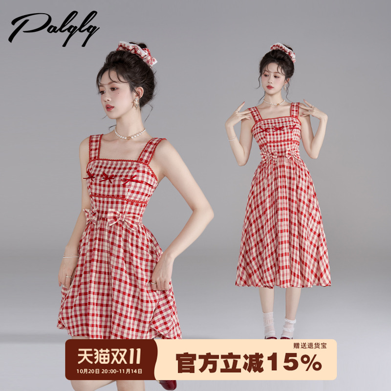 复古法式红色格子背带连衣裙女春秋2025年新款小个子甜美新年战袍