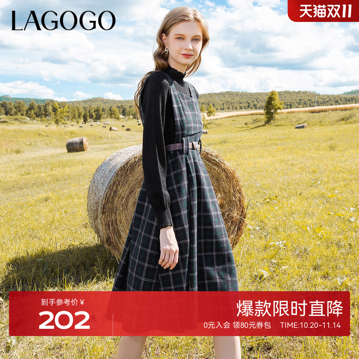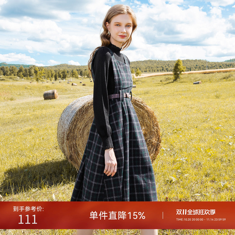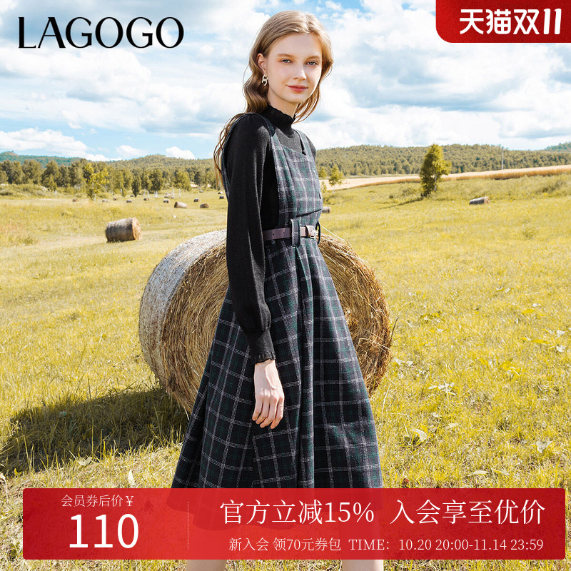 LAGOGO英伦风复古格子连衣裙女拉谷谷秋冬新款叠穿收腰显瘦背带裙