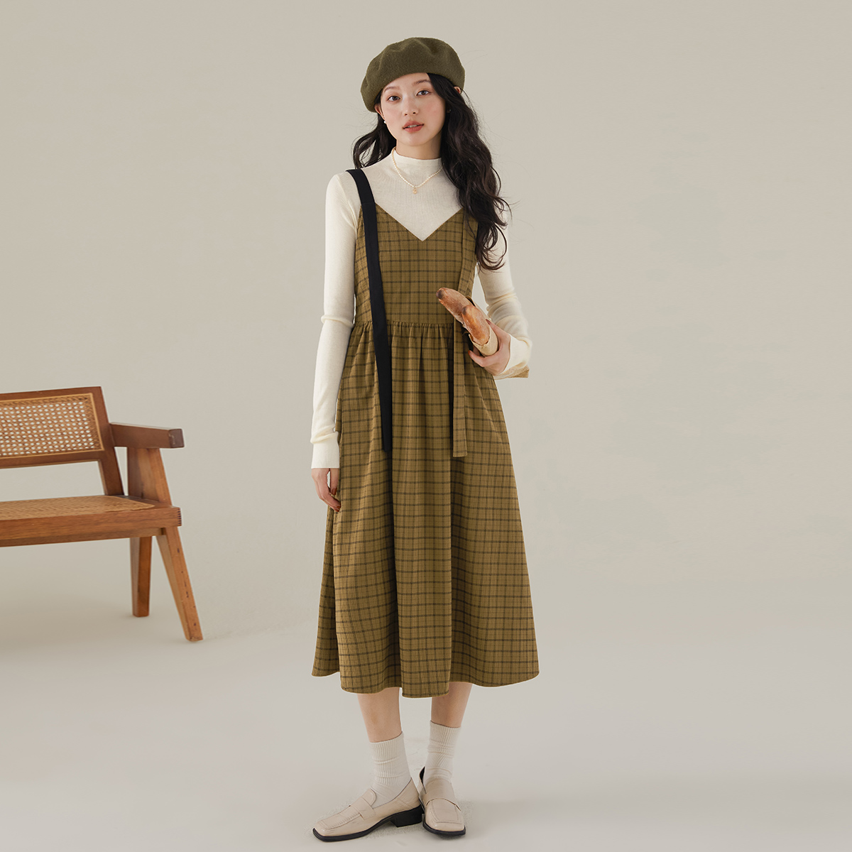 one more2025秋季新品法式毛呢连衣裙背心裙高级感格子背带裙女裙