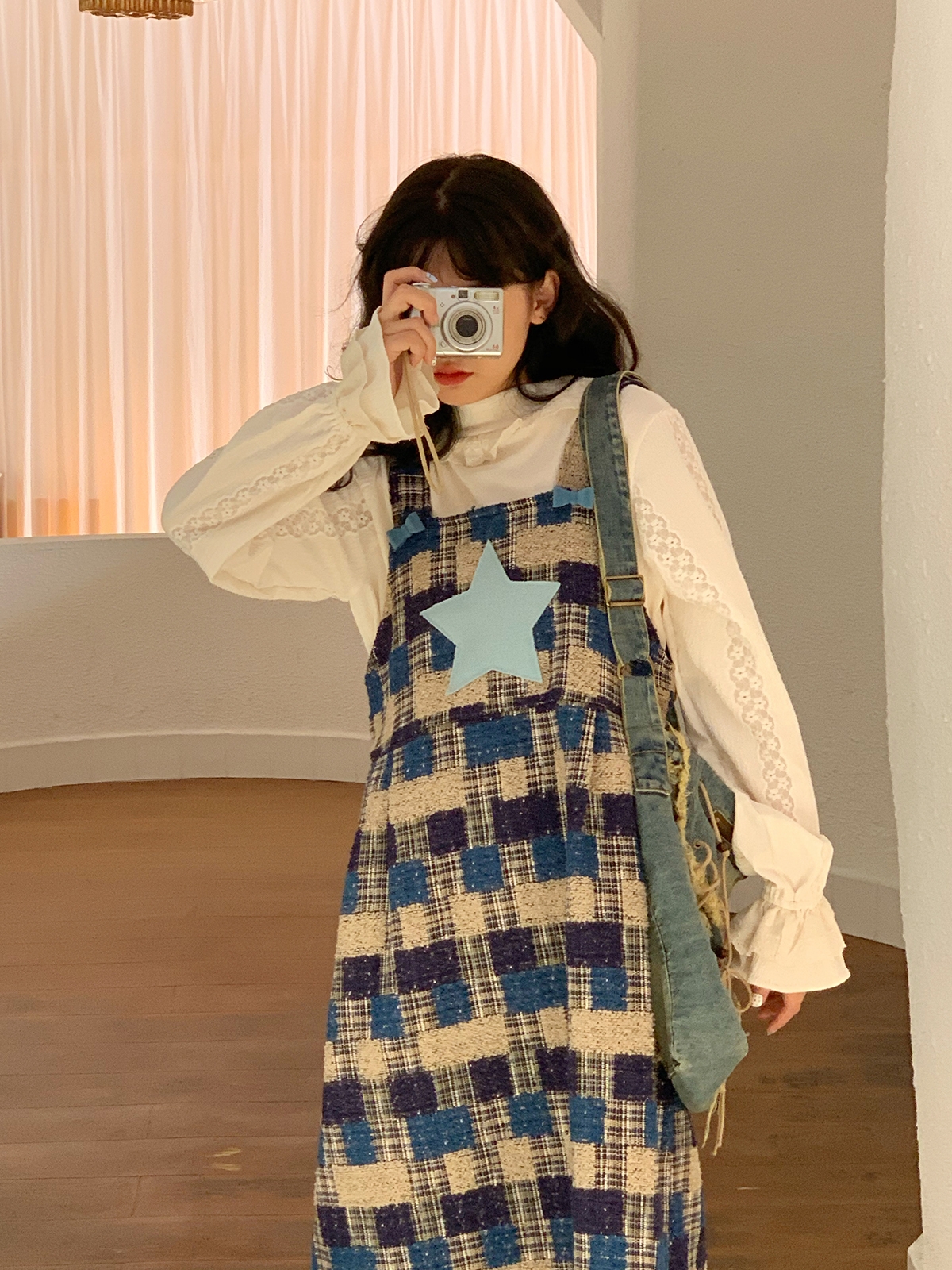 森女部落2025冬装原创甜美格子拼色白色花边宽松背带裙闺蜜打底裙
