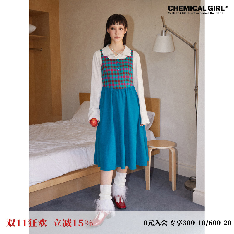 化学少女「公园野餐」2025年春季复古格子拼接背带裙背心连衣裙