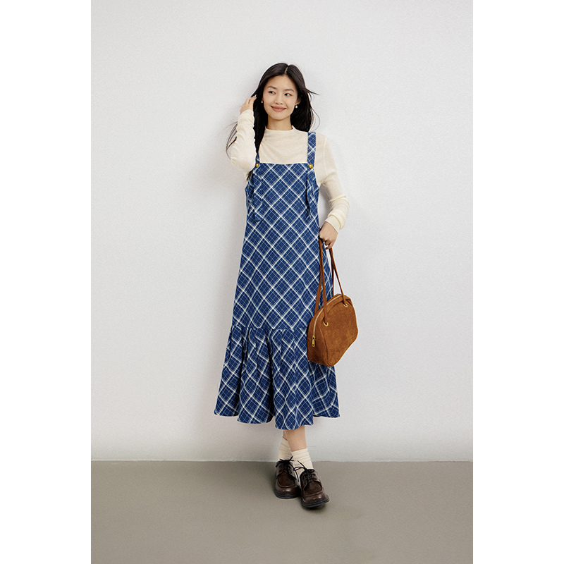 弥古蓝色格子牛仔裙修身吊带连衣裙女春秋外穿背带裙气质格纹长裙