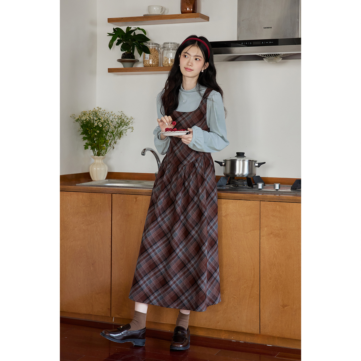 蛋包饭餐厅【蓝色星球】格子复古背带连衣裙女春季2025春长款裙子