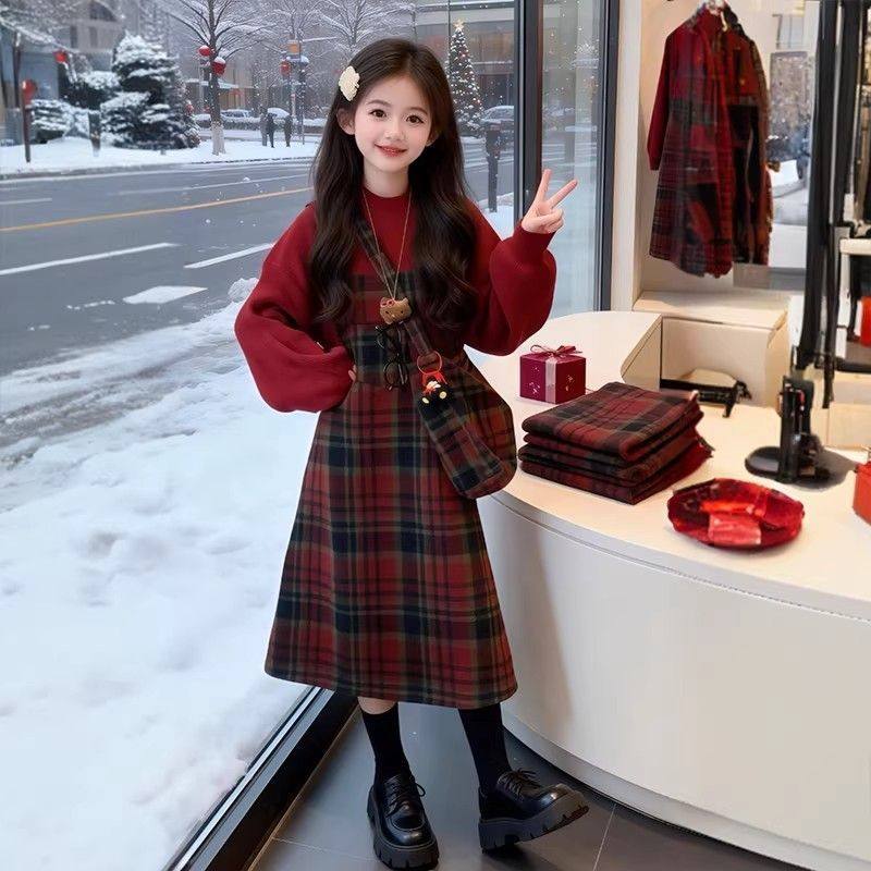 女童连衣裙冬季高级感红色格子背带裙2025新款新年战袍衣服冬女孩