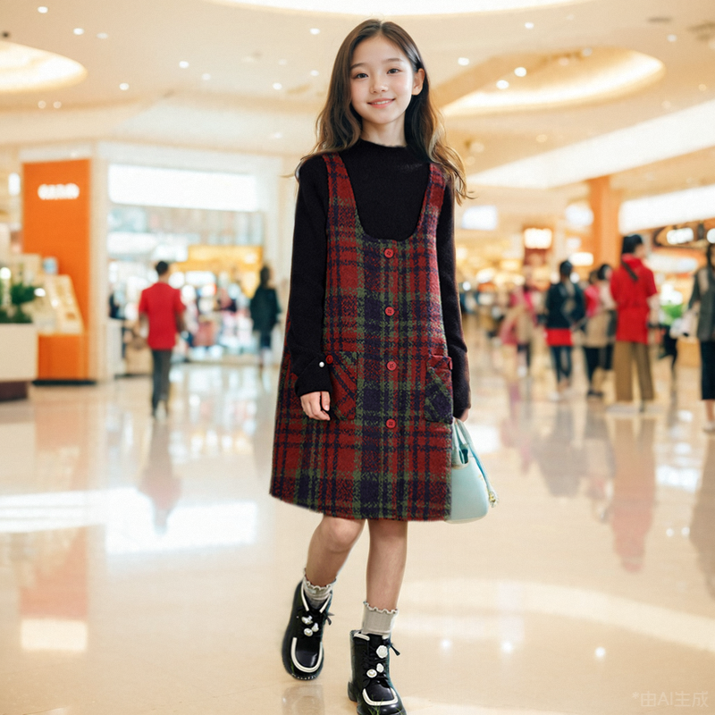 女童呢子套装裙2025秋冬季新年儿童洋气背带裙格子背心裙气质裙子