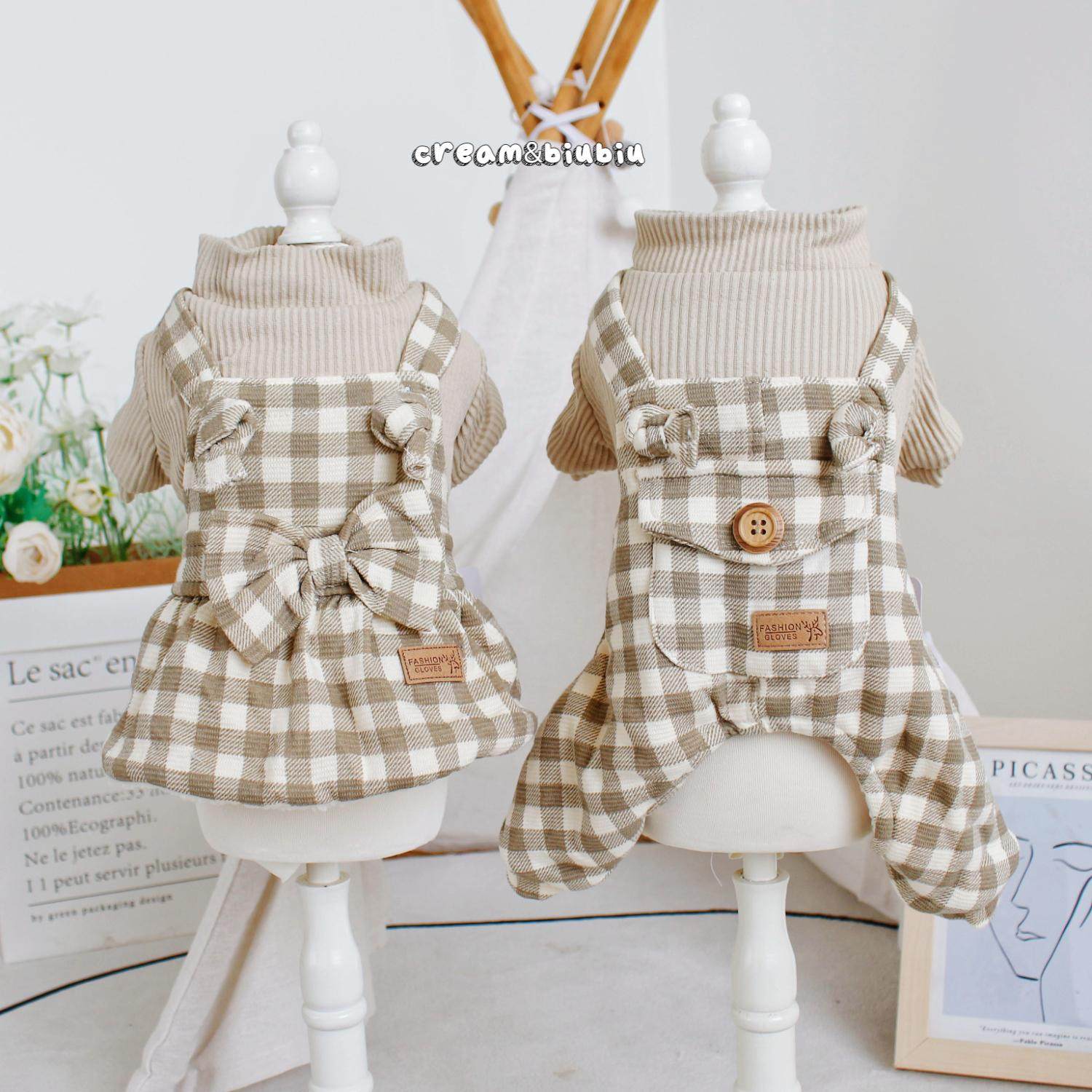 宠物狗狗猫咪衣服加绒厚款格子情侣装背带裙四脚裤泰迪比熊约克夏