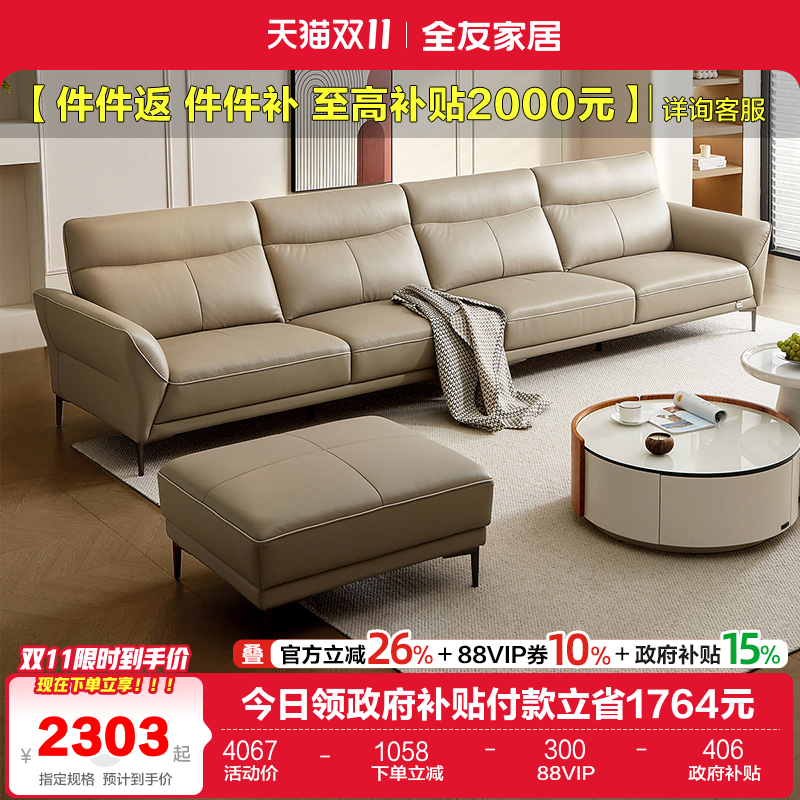 全友家居现代简约直排真皮沙发客厅家用2025年新款小户型皮艺沙发