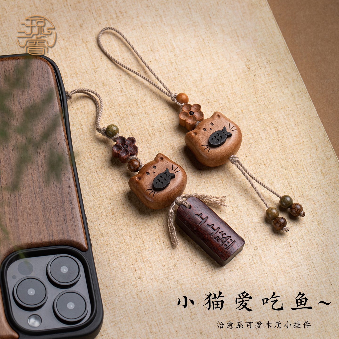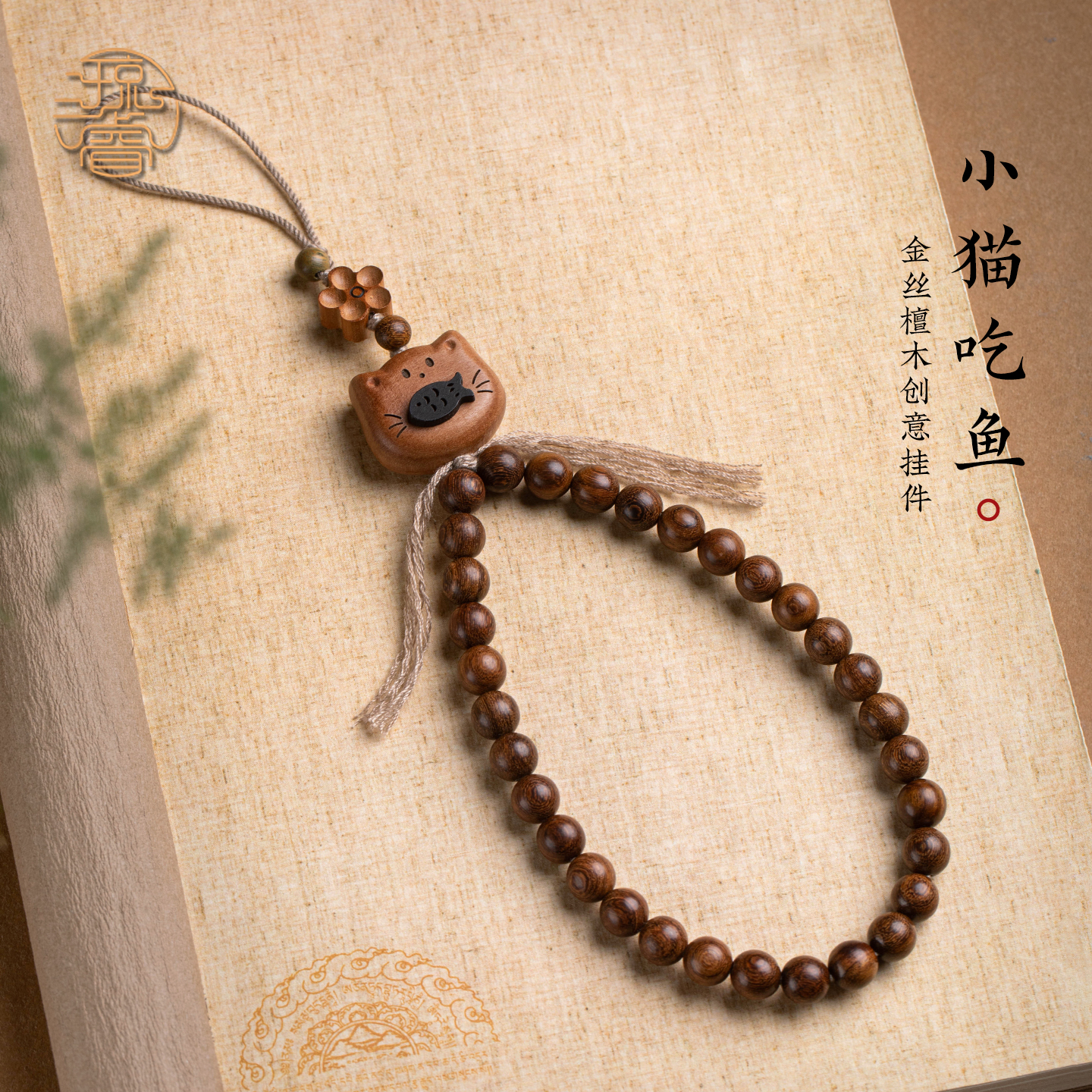 琼睿原创金丝檀木手机挂绳短款串珠手腕绳老桃木招财猫手机链卡通猫咪手机壳小挂件天然木质相机挂坠优盘挂饰
