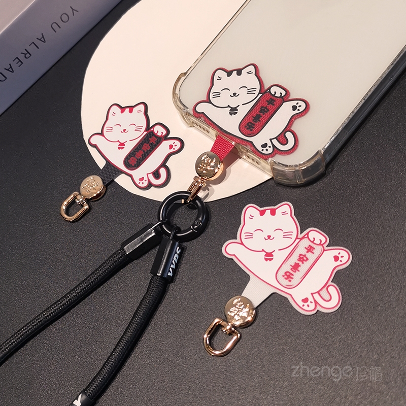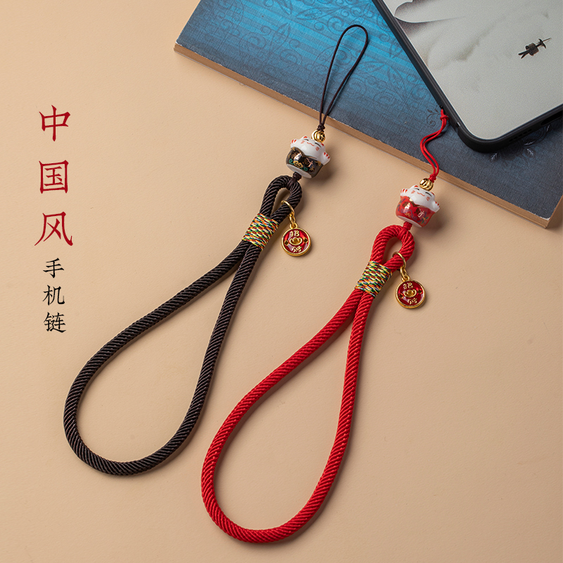 招财猫手机挂绳加粗手腕电话绳结实耐用黑色耐脏手绳腕带中国风公仔挂件男款防丢女钥匙扣挂饰玄学夹片卡片壳