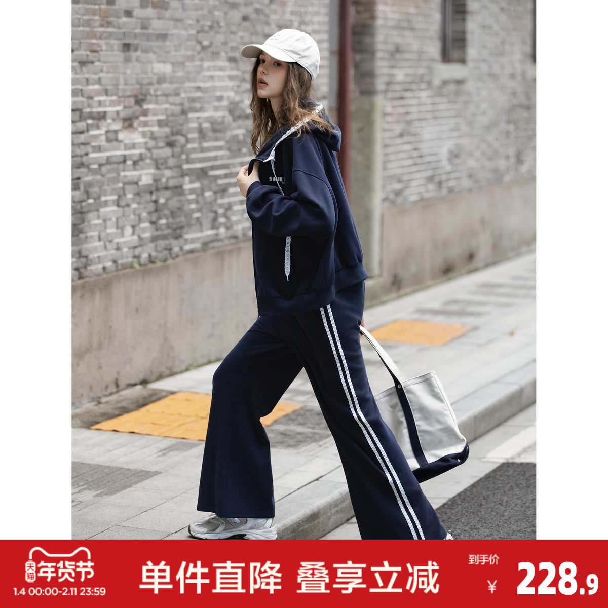 唐狮2026秋冬季套装女开衫连帽卫衣蕾丝设计感独特小众卫裤子套装