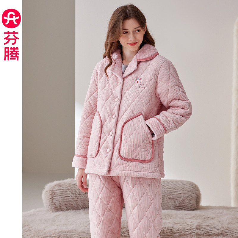 芬腾抗静电夹棉睡衣女冬季三层加厚加绒棉袄冬款珊瑚绒家居服套装