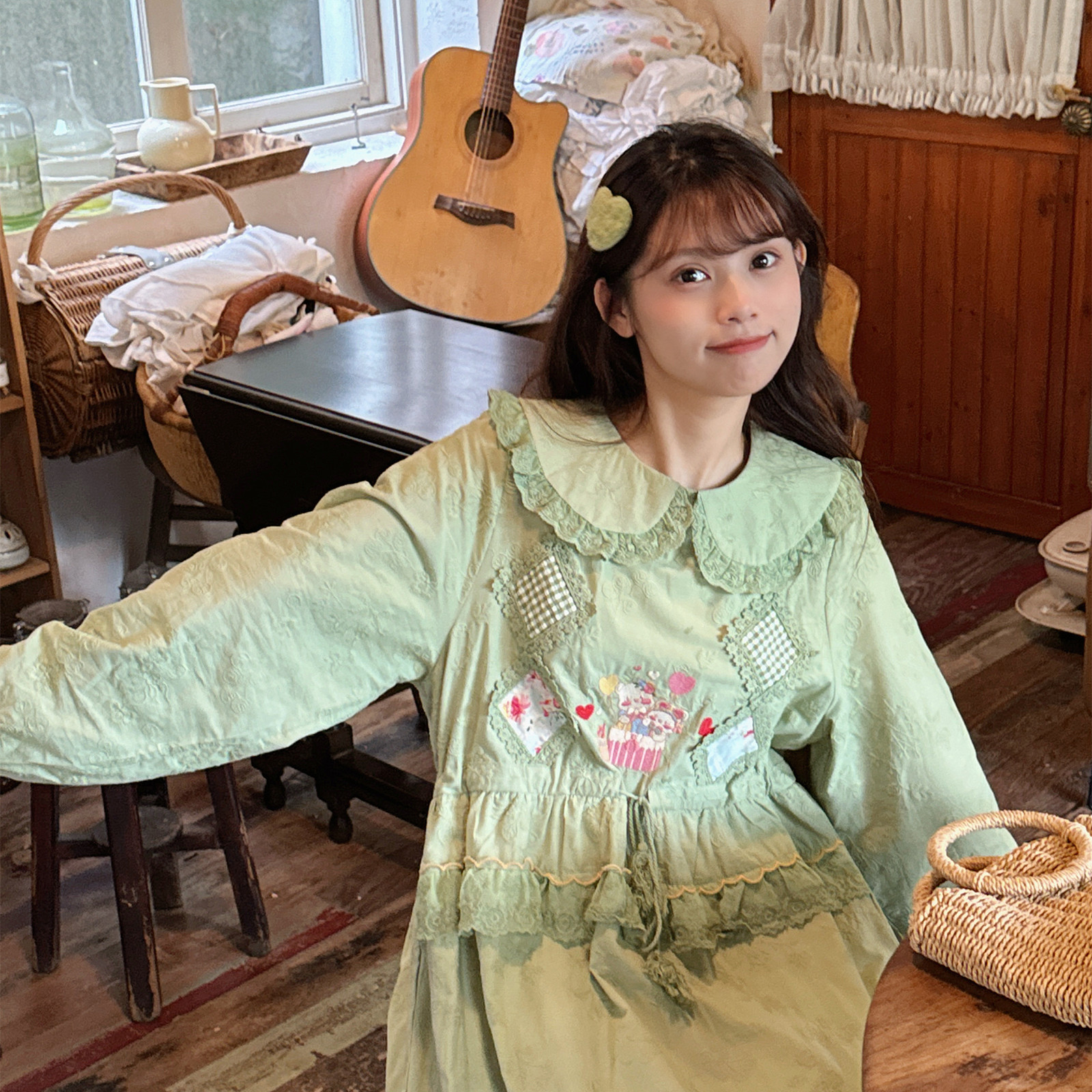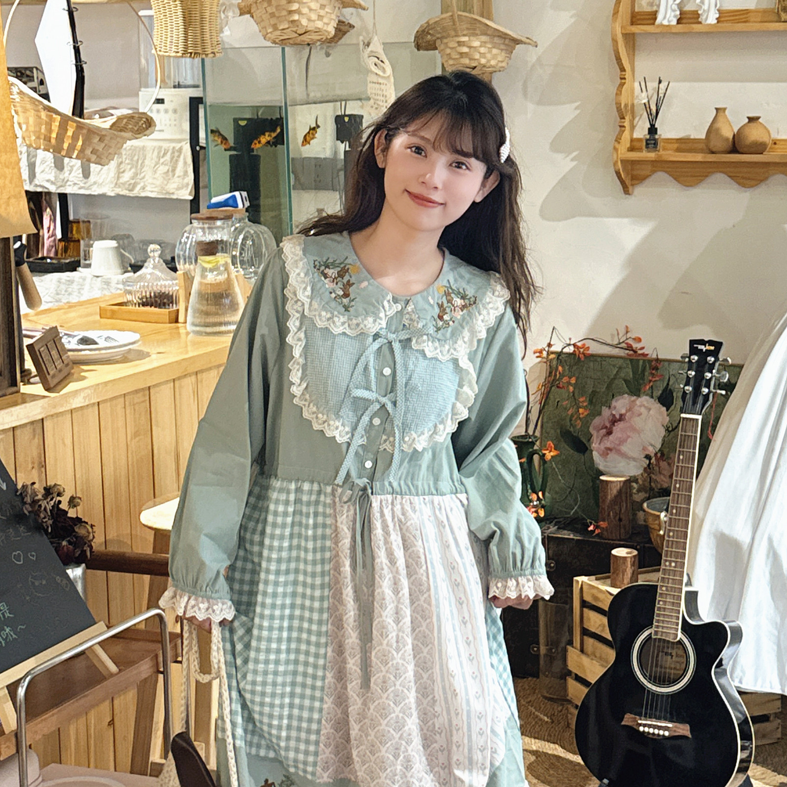 秋季森系复古清新浅绿色绣花娃娃领长袖连衣裙田园碎花拼接长裙子