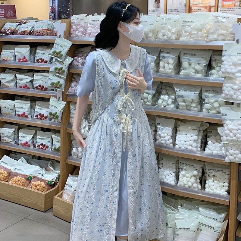 森女甜美部落2025夏季小清新套装裙小众短袖连衣裙罩衫叠穿两件套