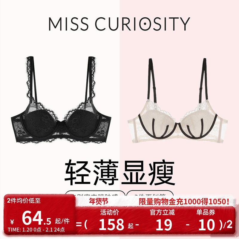 好奇蜜斯蕾丝法式内衣女性感无钢圈文胸罩套装薄纯欲夏三角杯白色