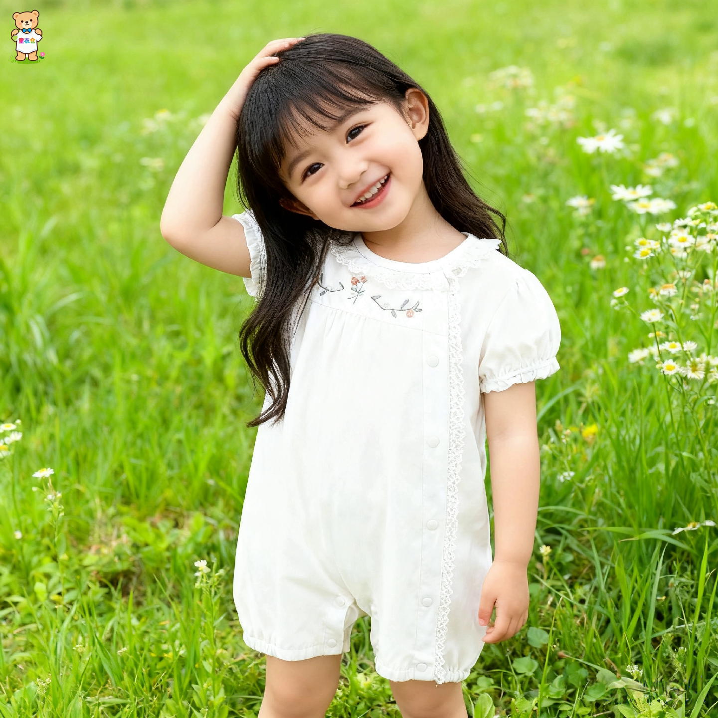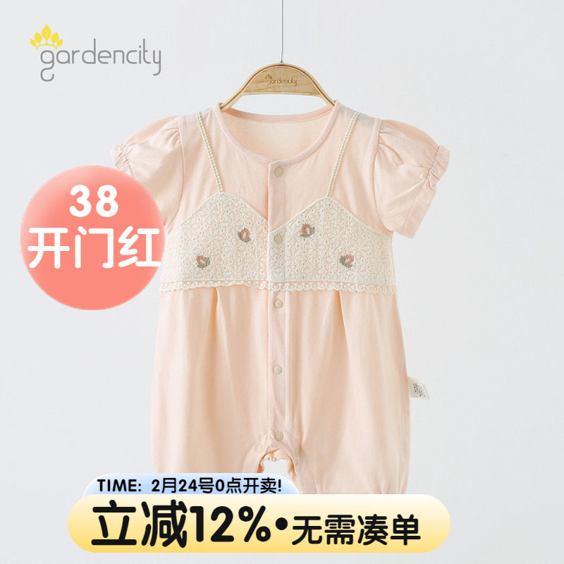婴儿女宝宝2026夏季新款甜美蕾丝花边拼接偏襟短袖短裤连体衣爬服