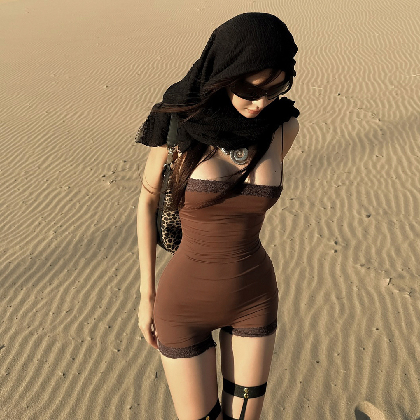 HEYOUNGIRL沙丘废土风棕色蕾丝拼接吊带连体裤复古辣妹一体式短裤