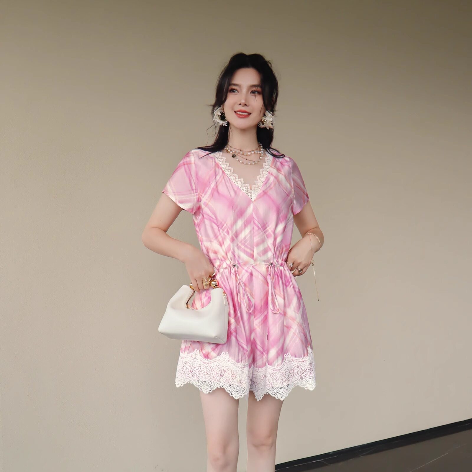 法式浪漫粉色格纹甜美印花精致蕾丝花边拼接抽绳收腰通勤连体短裤