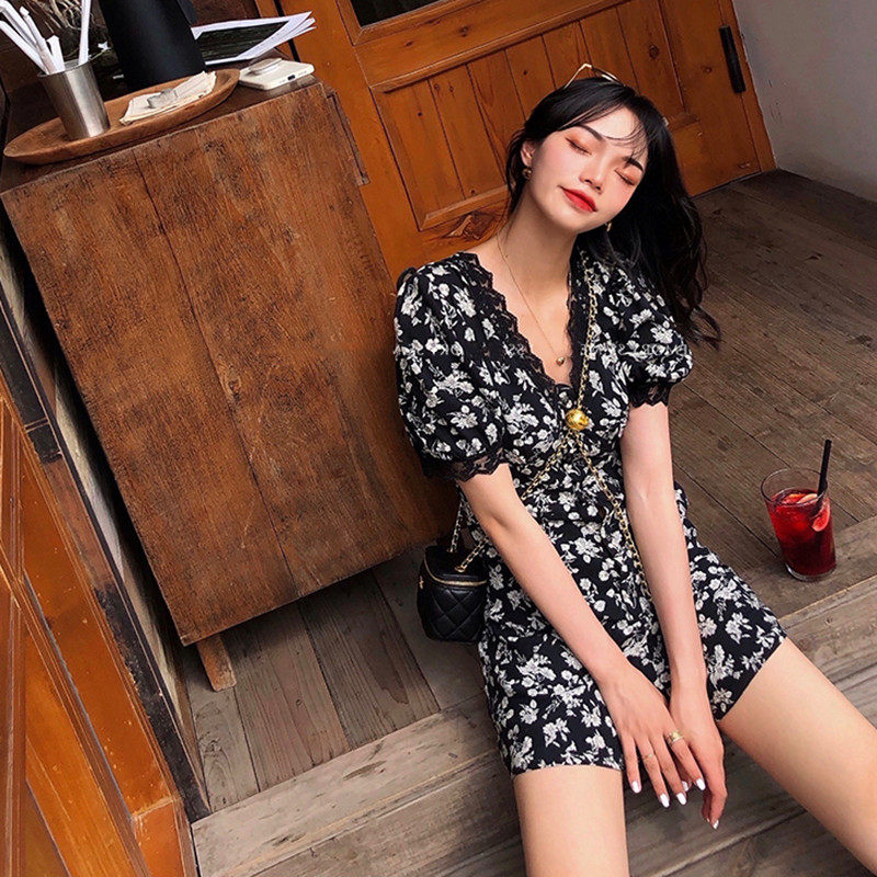 DARLINGAGA法式少女感碎花连体短裤女蕾丝拼接胸型V领修身打底裤