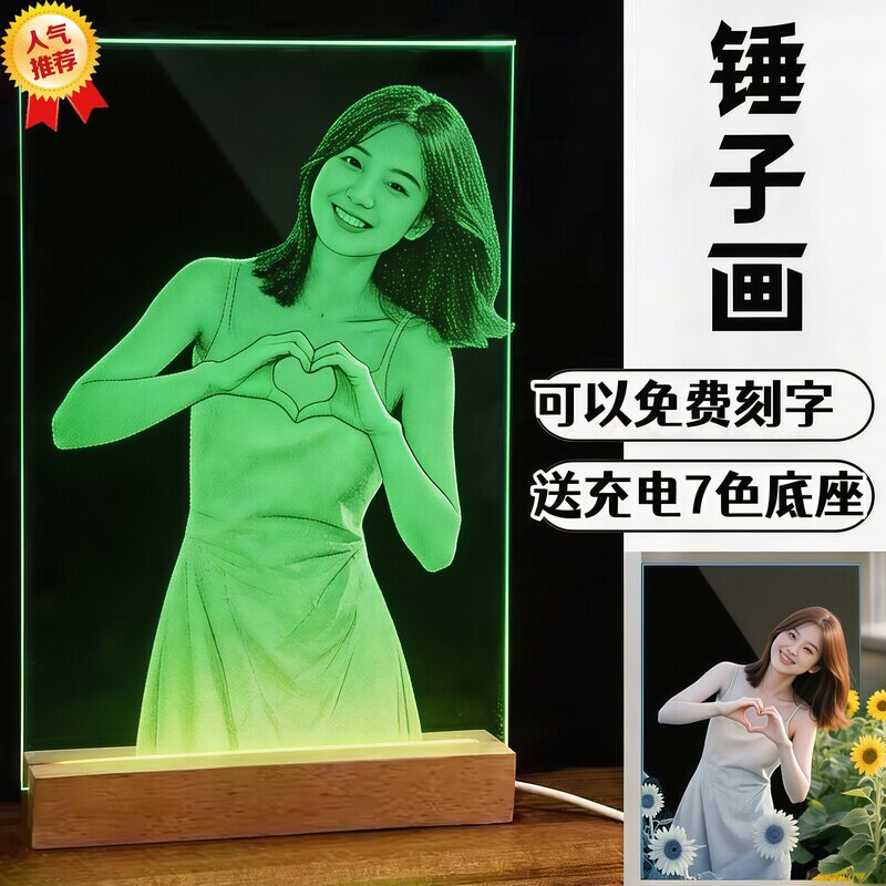 锤子玻璃画定制照片摆件灯光画生日520礼物送女朋友老婆纪念礼品