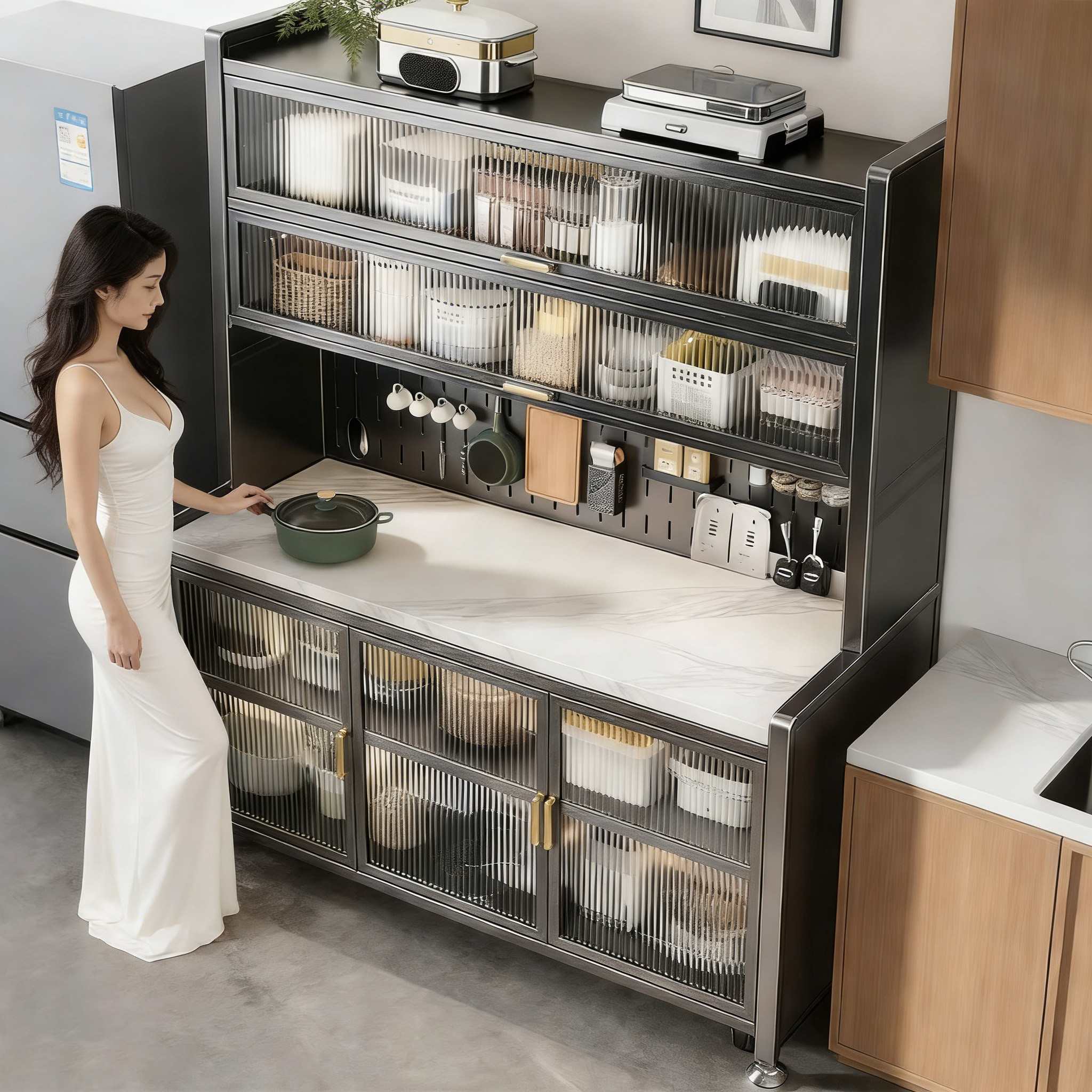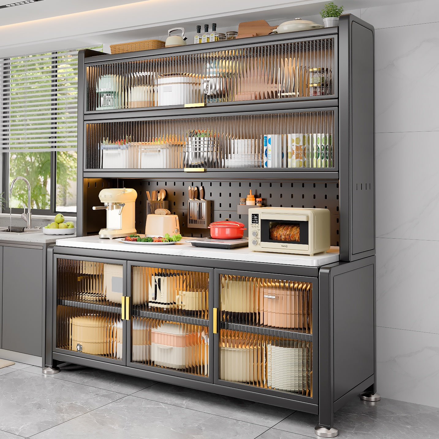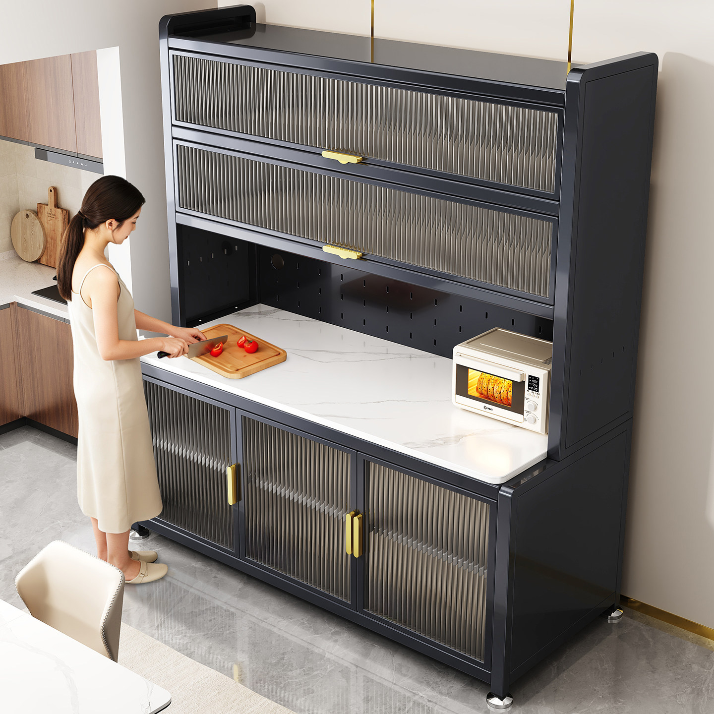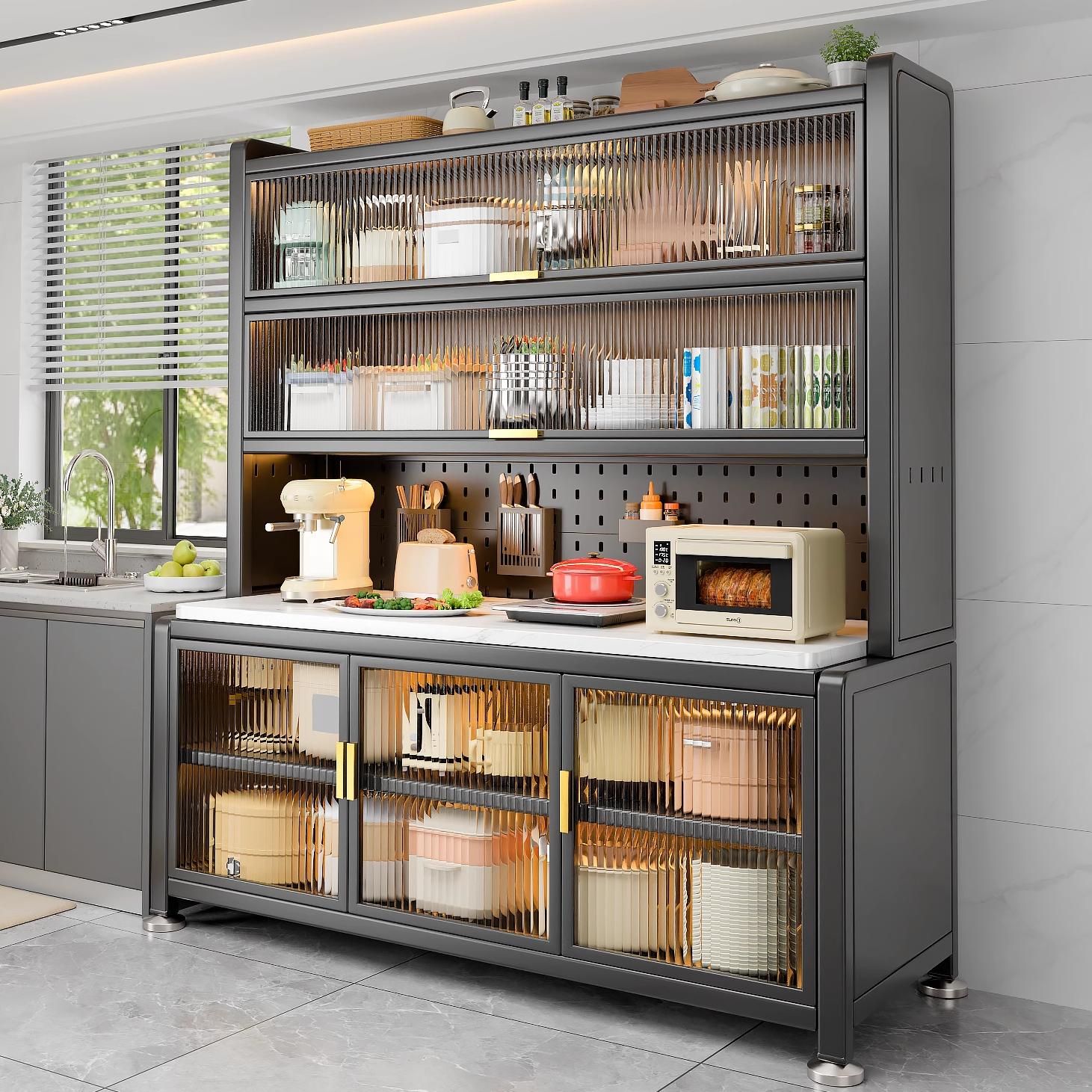 岩板厨房置物架多功能家用碳钢餐边柜新款微波炉储物柜收纳橱柜子
