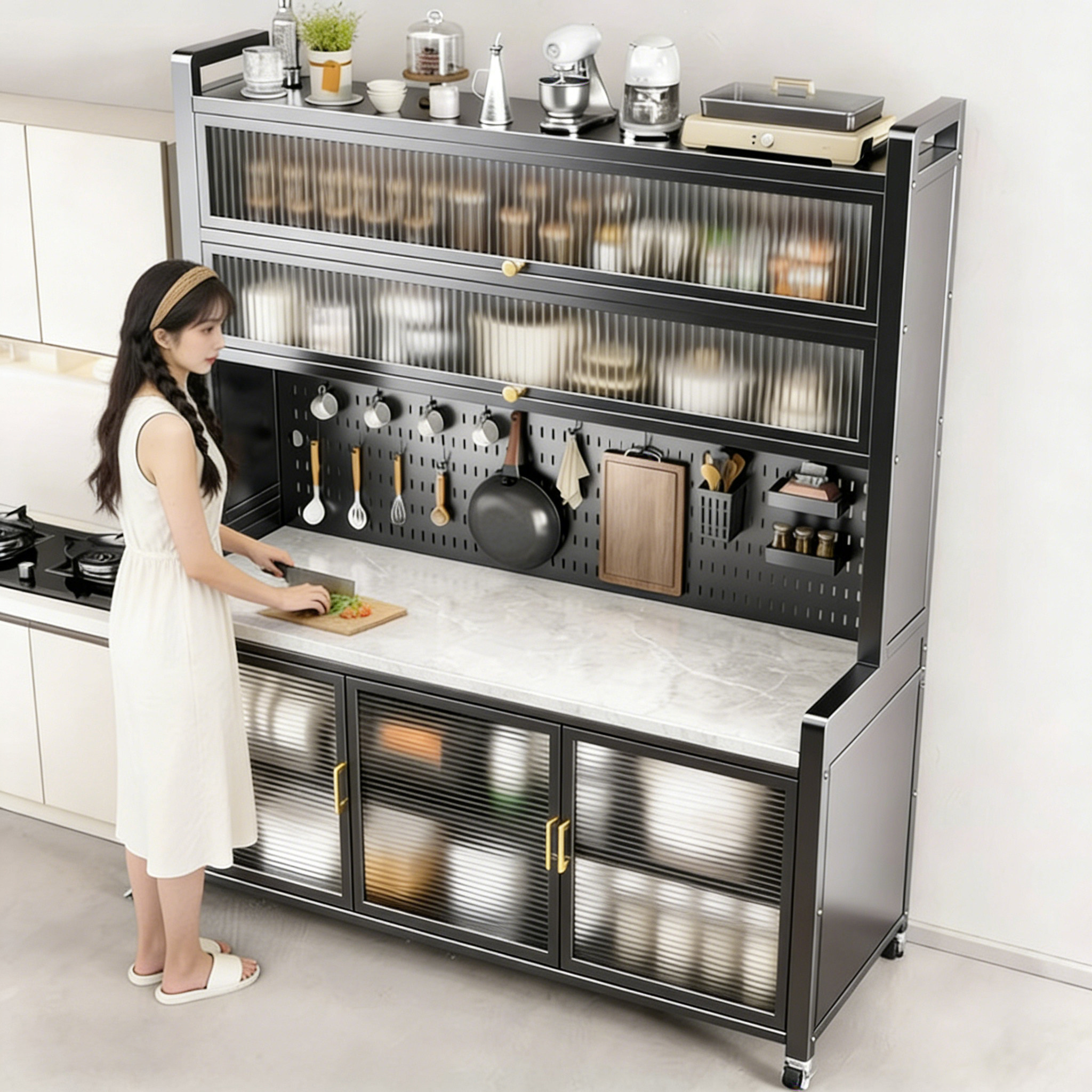 厨房置物架落地碳钢餐边柜微波炉烤箱岩板切菜台厨房储物台面橱柜