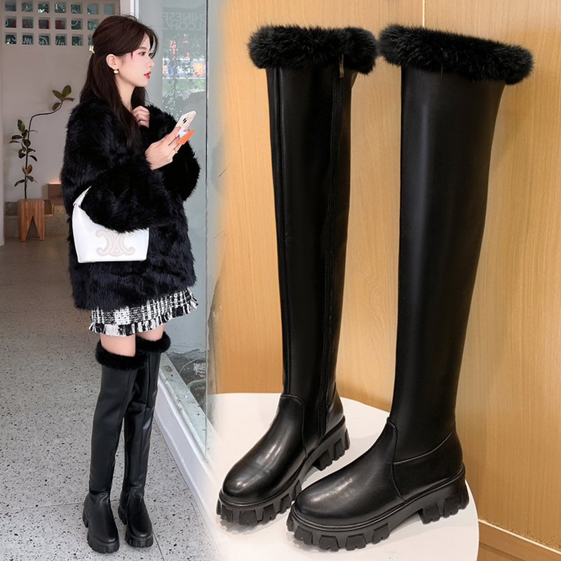 真皮靴子厚底长靴过膝靴女鞋平底长筒靴冬季加绒加厚羊毛棉靴大码