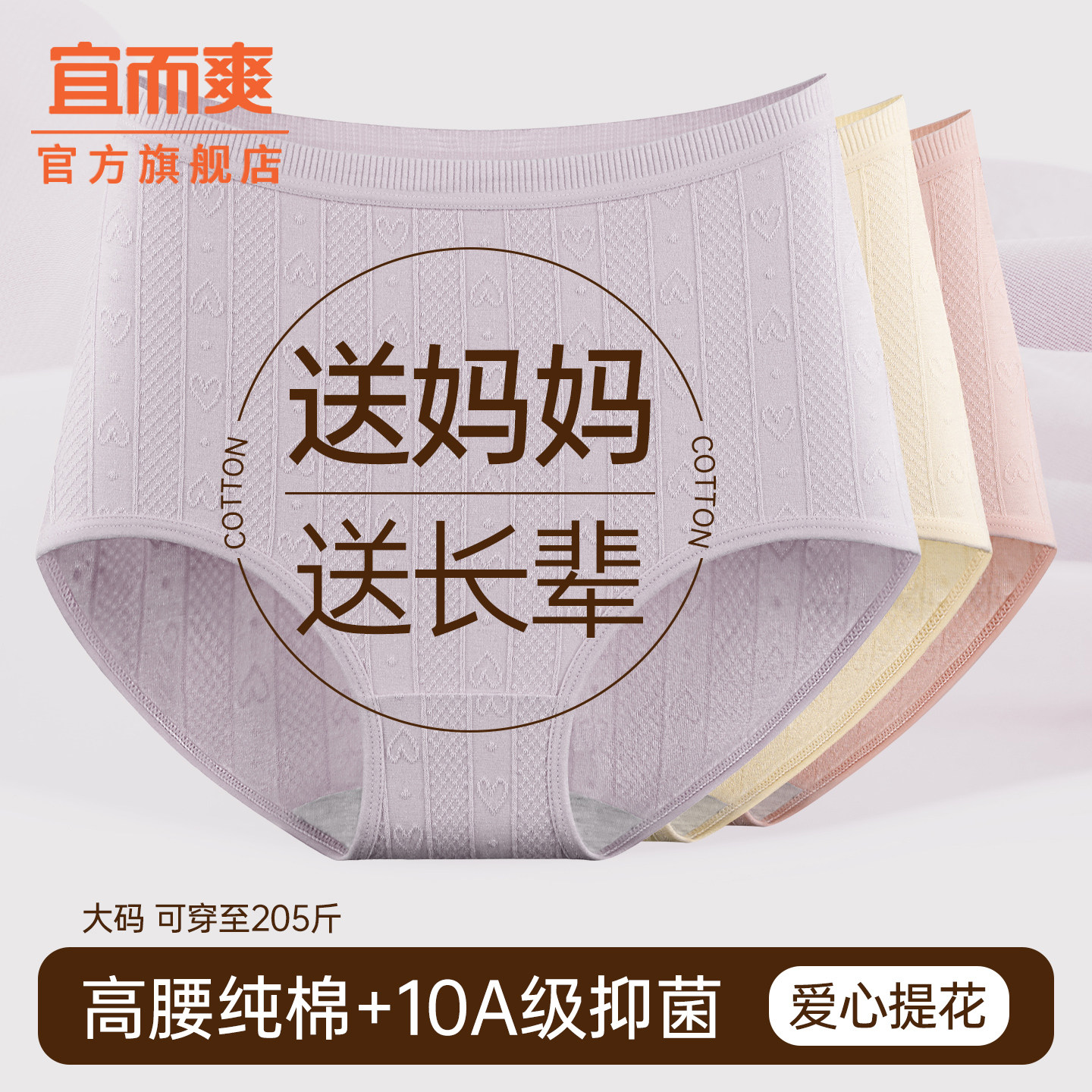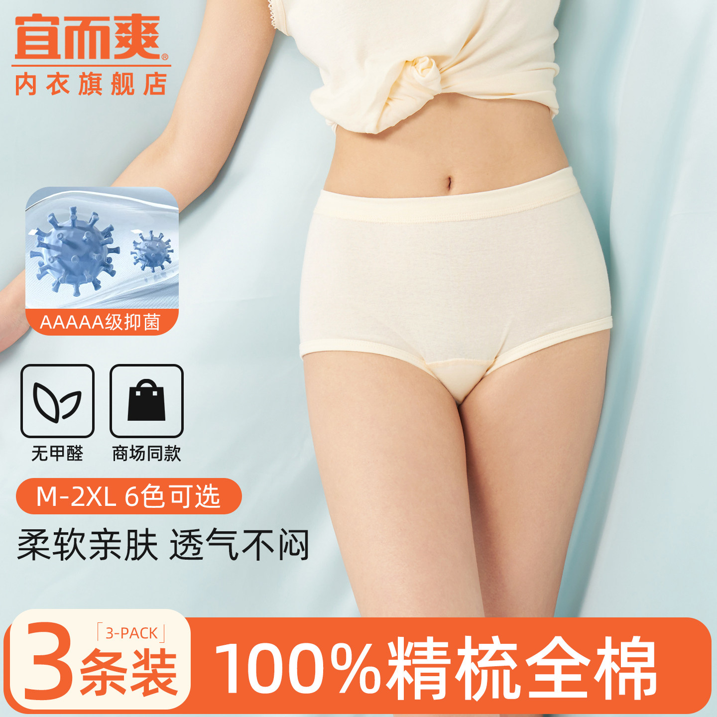 宜而爽纯棉女士内裤7A级抑菌全棉底档弹力中腰款无痕加长三角内裤