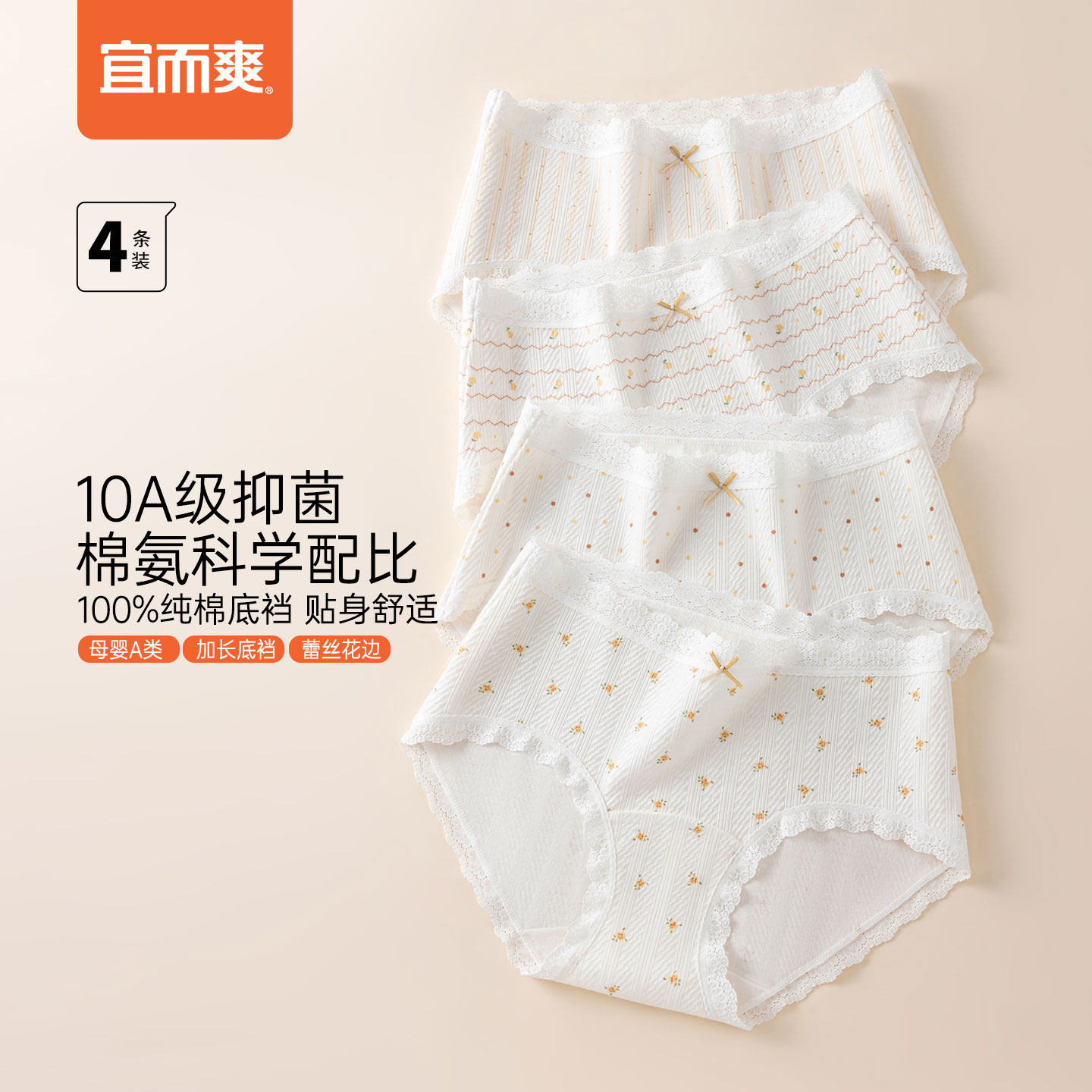 [4条]宜而爽女士10A抑菌纯棉内裤柔软棉氨抑菌高腰弹力三角内裤