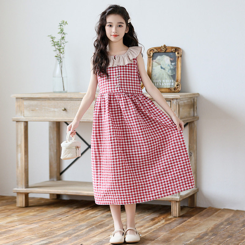 女童长裙夏季无袖背心格子连衣裙2026新款中大童儿童洋气度假裙子