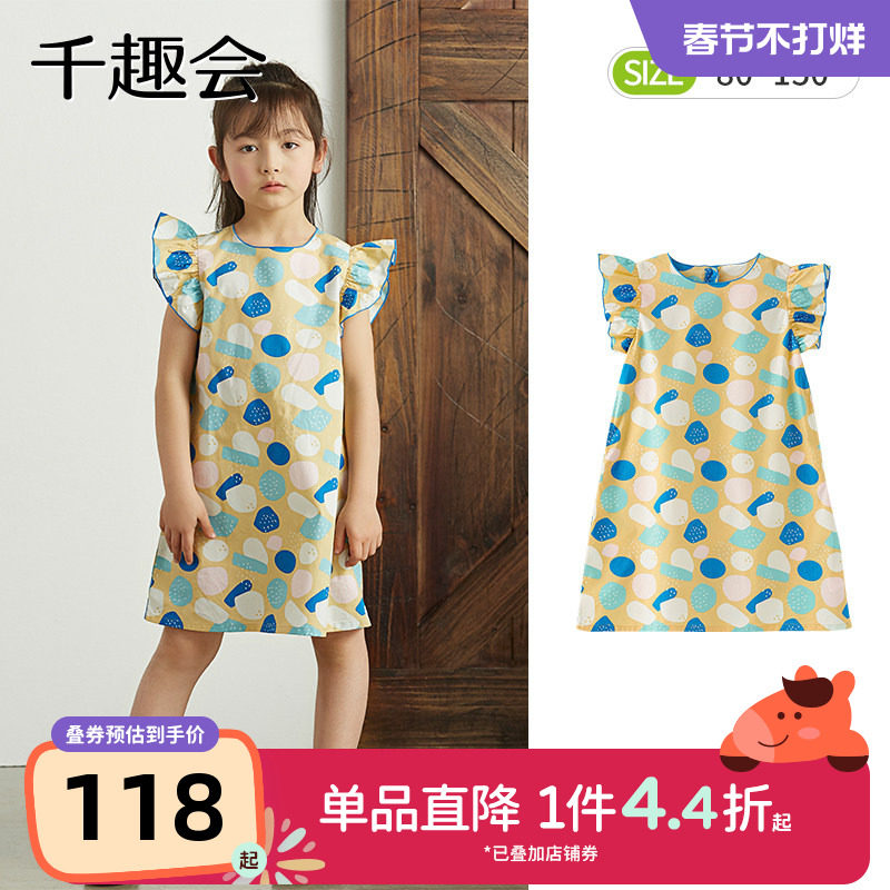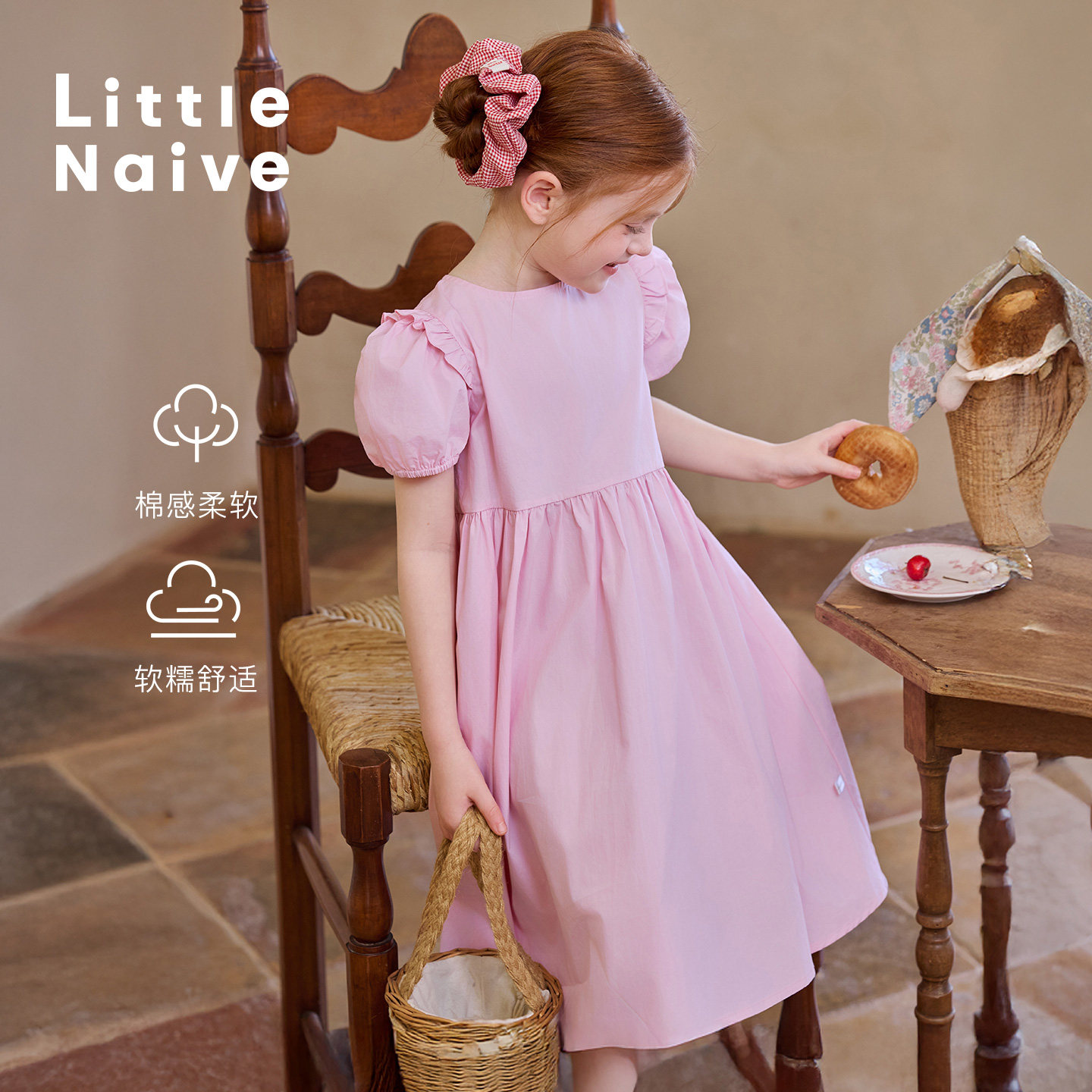 Little Naive儿童纯棉泡泡袖连衣裙夏季甜美木耳边裙子女童长裙