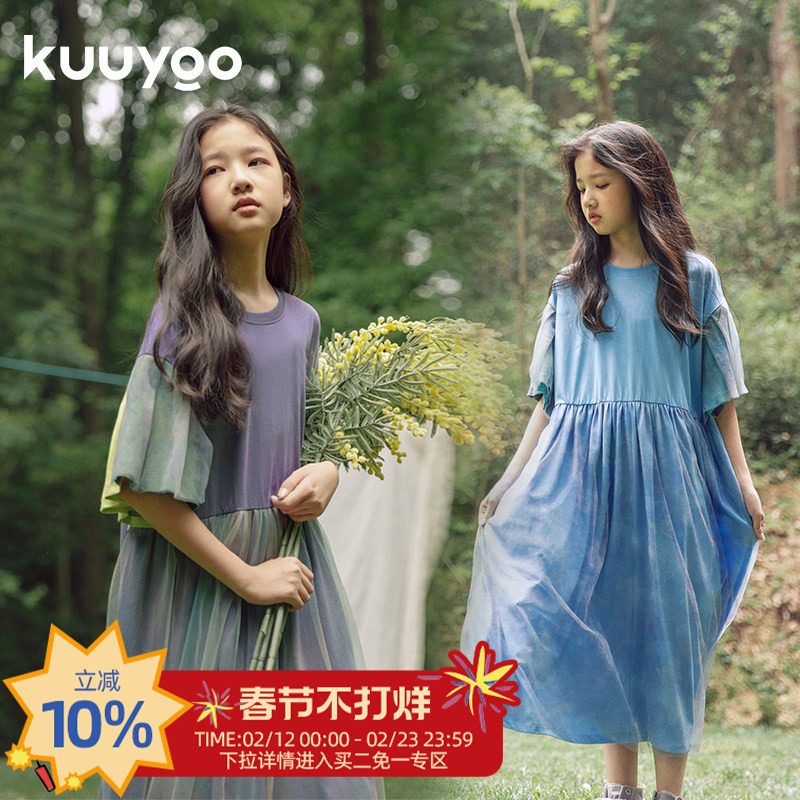 KUUYOO儿童全棉针织撞色拼接网纱连衣裙夏季宽松圆领两穿女童长裙