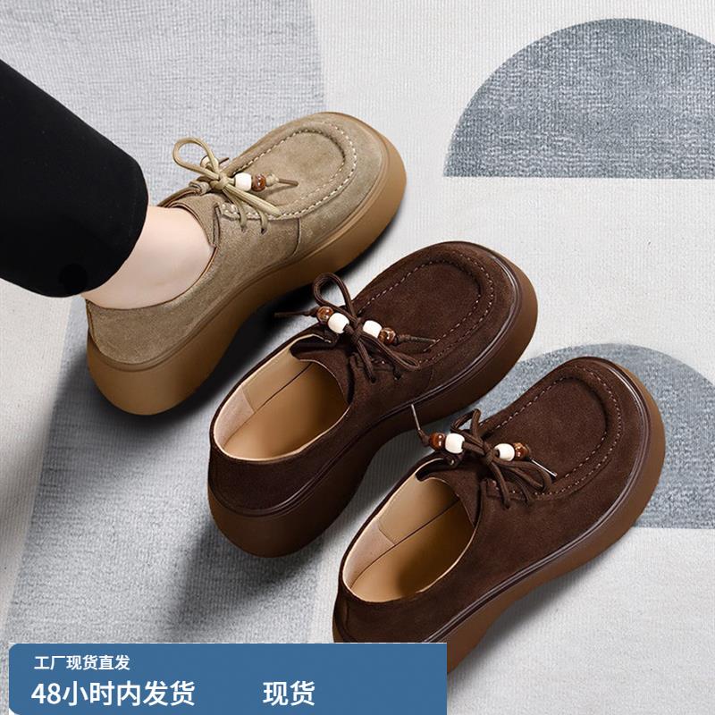 4cm磨砂牛皮拼色系带小众乐福鞋女2025新款百搭休闲厚底深口单鞋