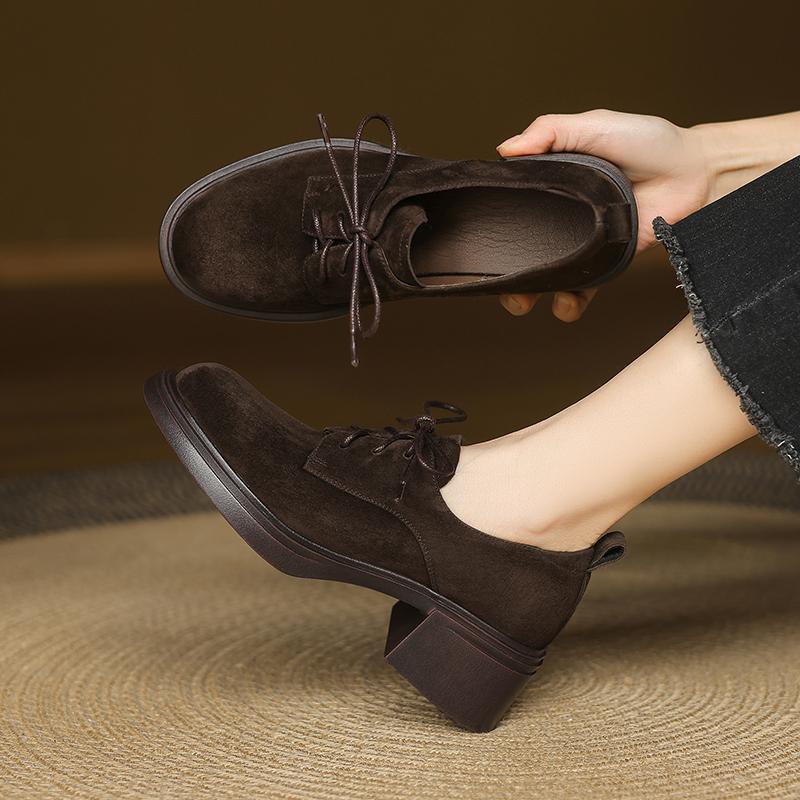 磨砂牛皮系带深口单鞋女春秋新款真皮英伦风粗跟圆头中跟厚底皮鞋