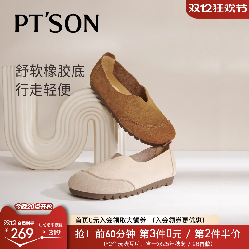 花藤萝蔓 磨砂牛皮圆头套脚深口休D闲软底软面平底真皮女鞋女单鞋