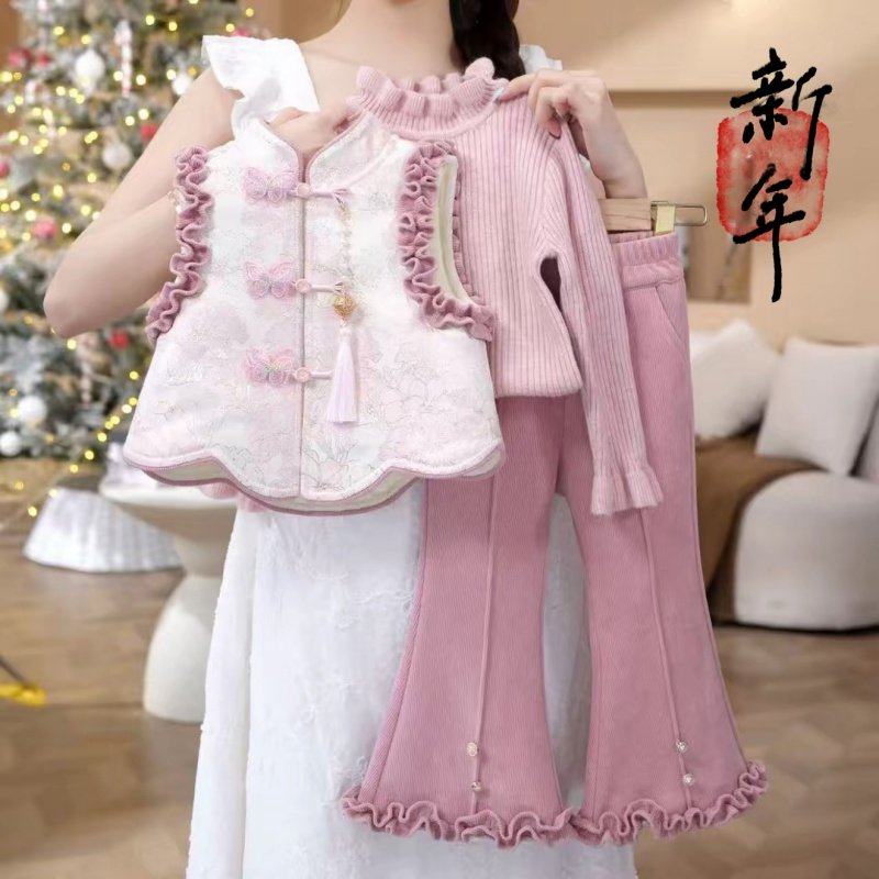 2025秋冬装新国风女童新中式马甲套装夹棉儿童唐装背心粉色三件套