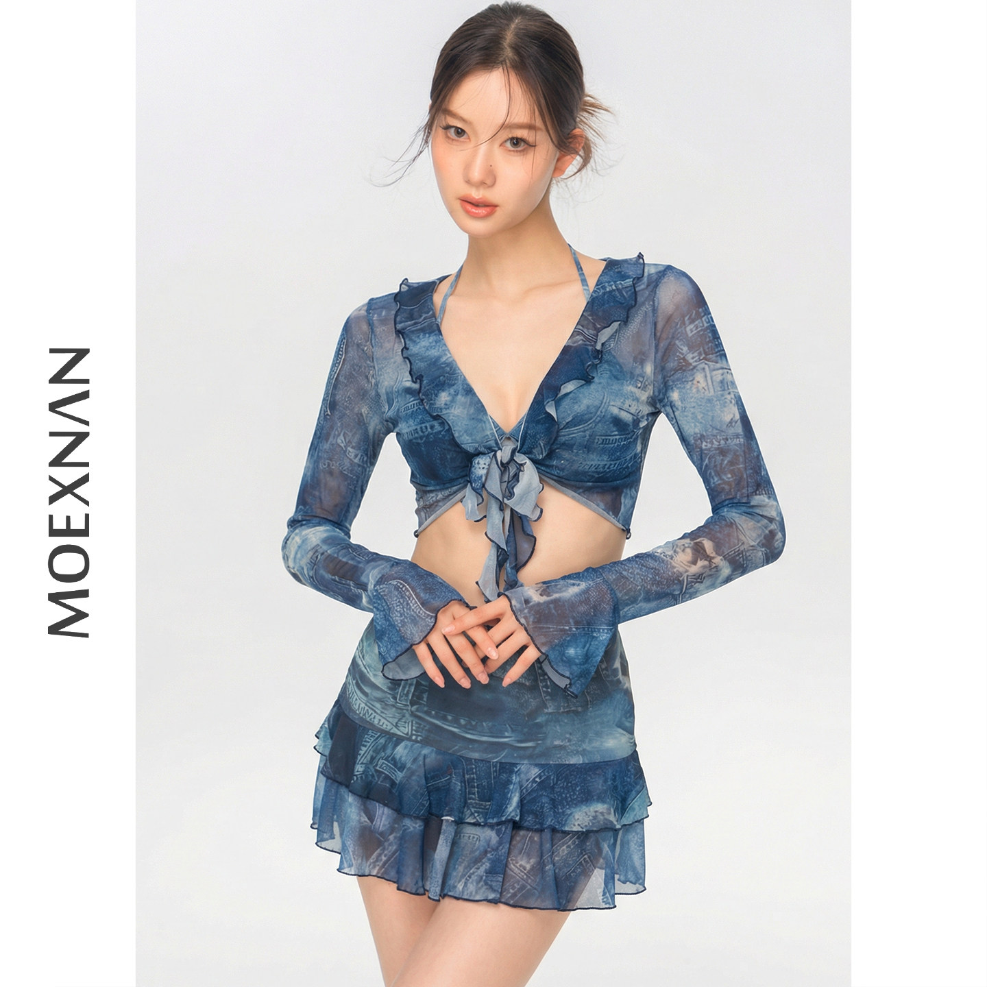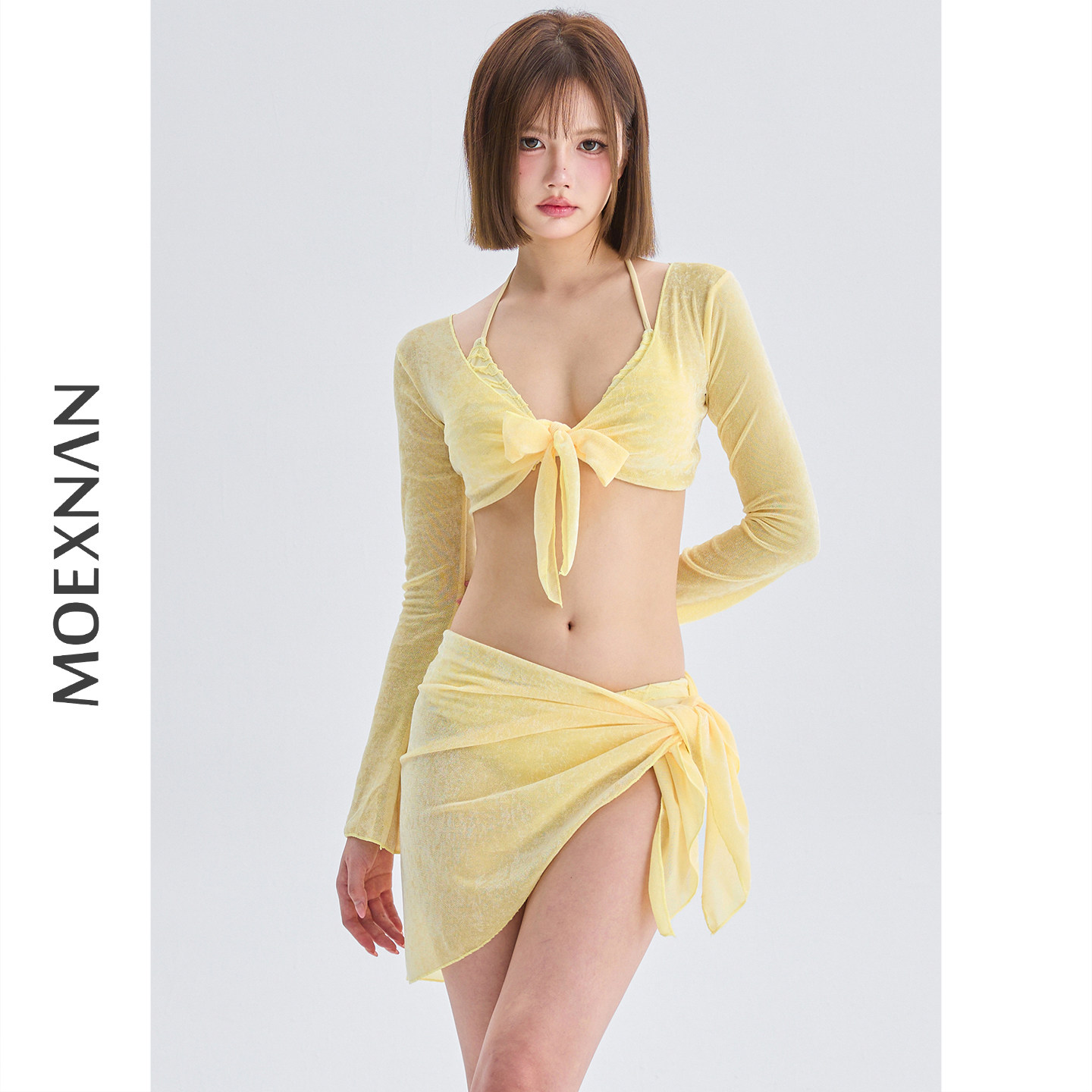 泳衣女复古性感比基尼三件套分体长袖防晒沙滩裙罩衫三角度假泳装