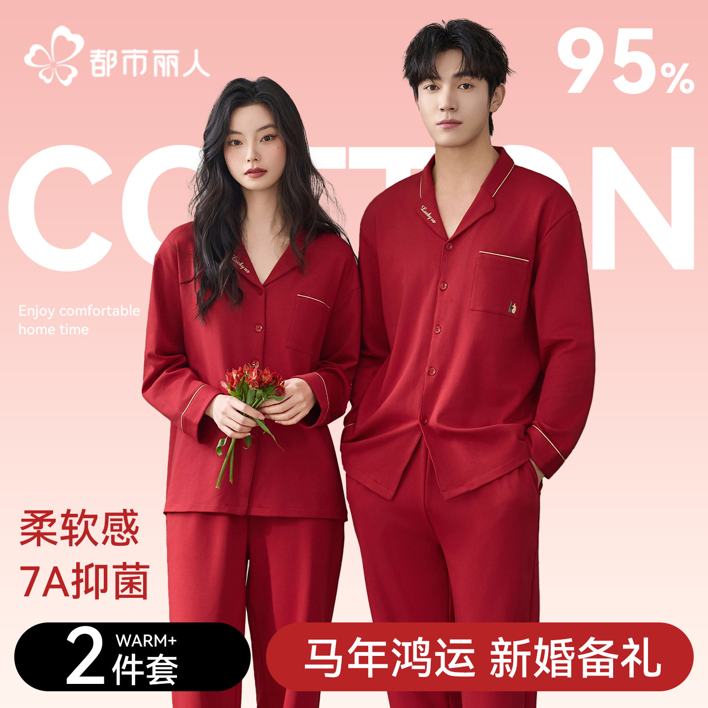 都市丽人纯棉睡衣结婚新婚情侣套装25新款春秋男女长袖红色家居服