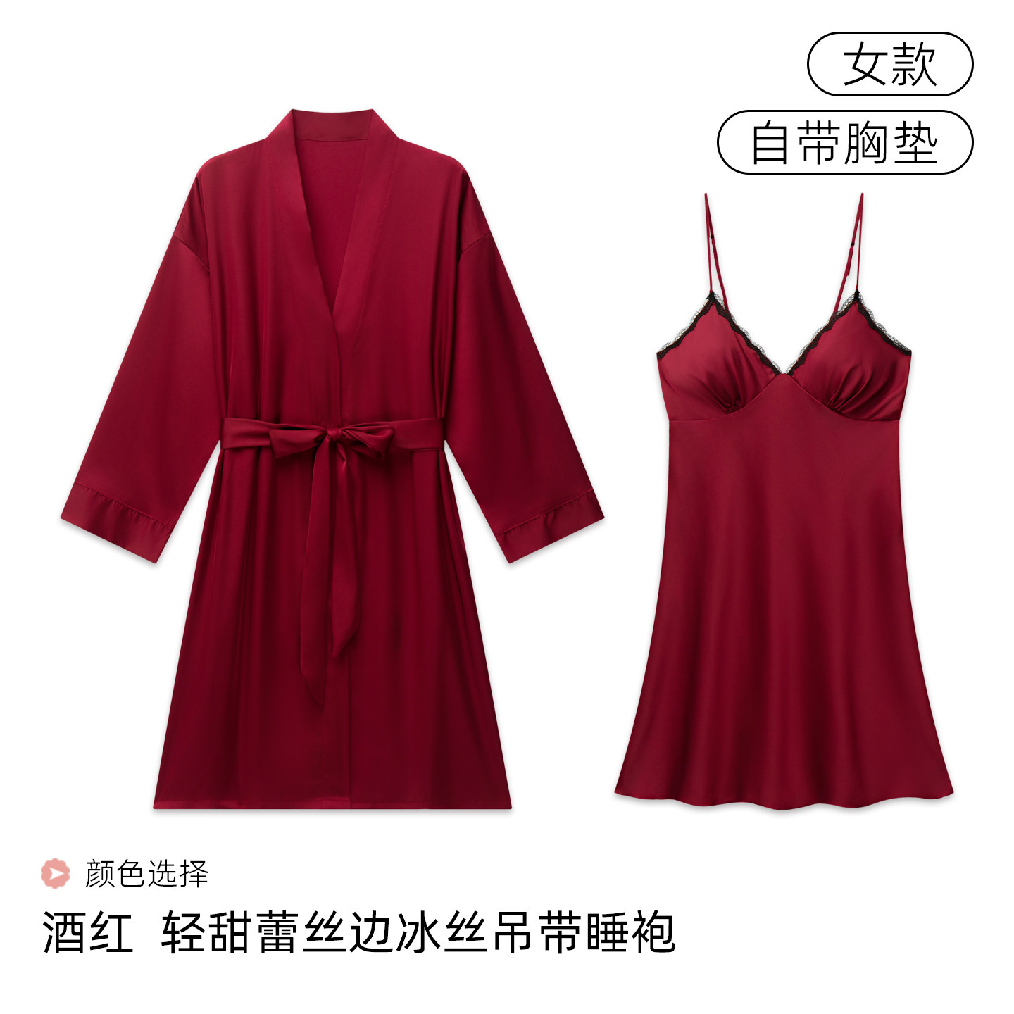 结婚新婚睡衣情侣复古酒红高级感蕾丝拼接吊带三件套女春秋夏套装