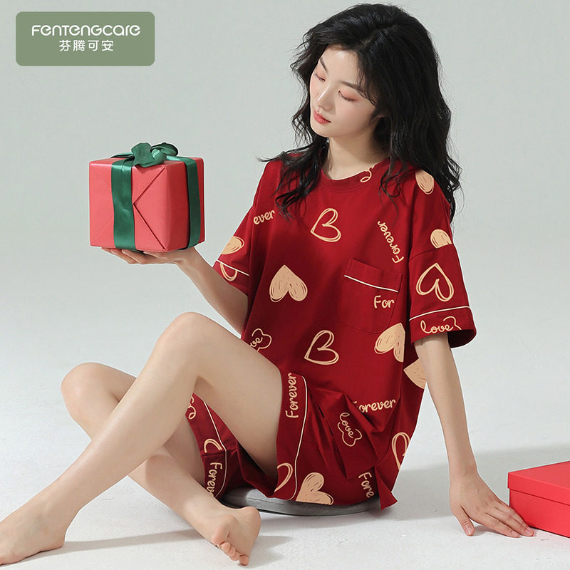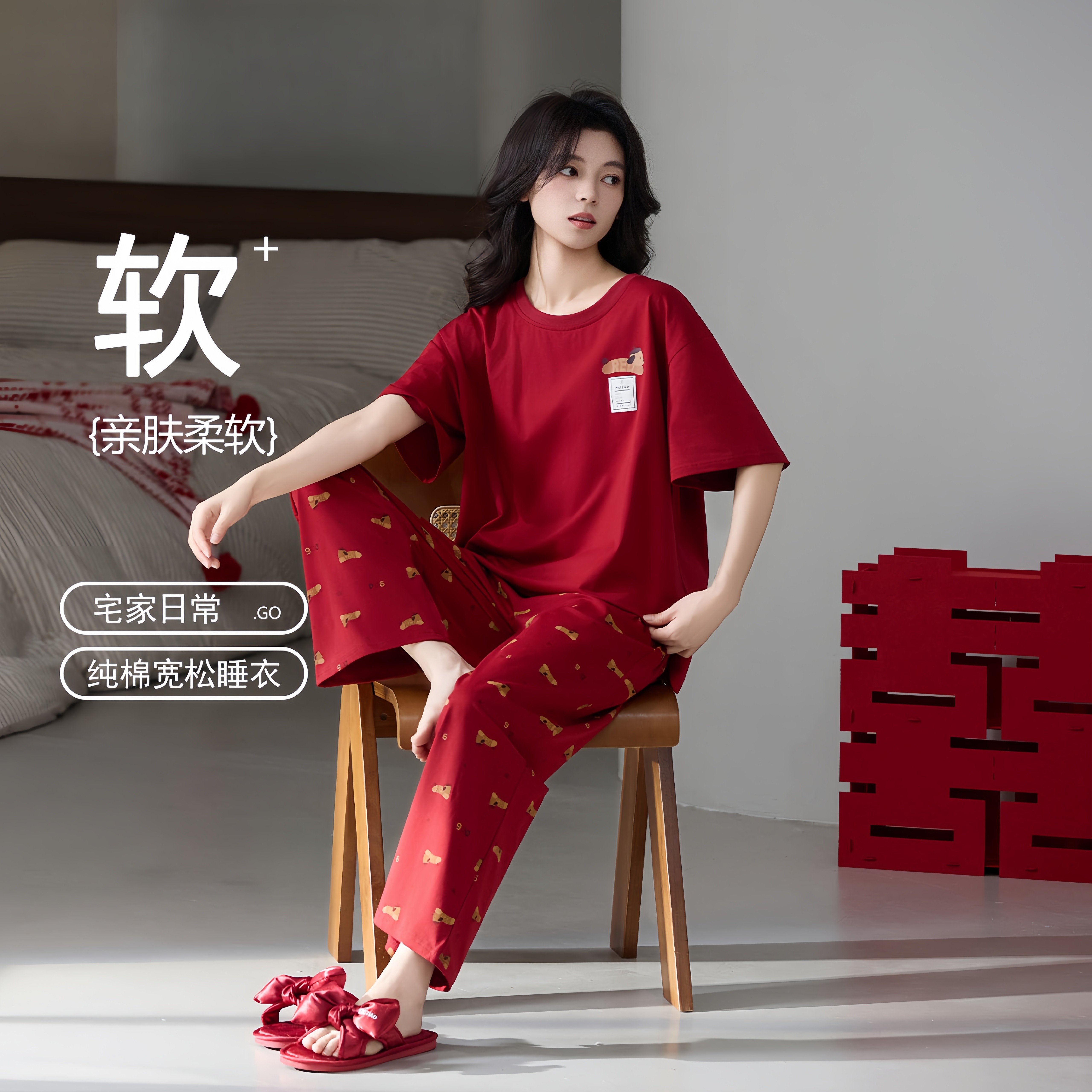 女士夏季纯棉短袖莱卡棉红色套装结婚新婚睡衣女夏天本命年家居服