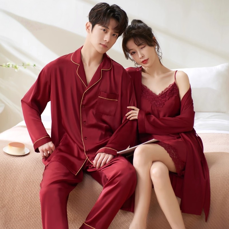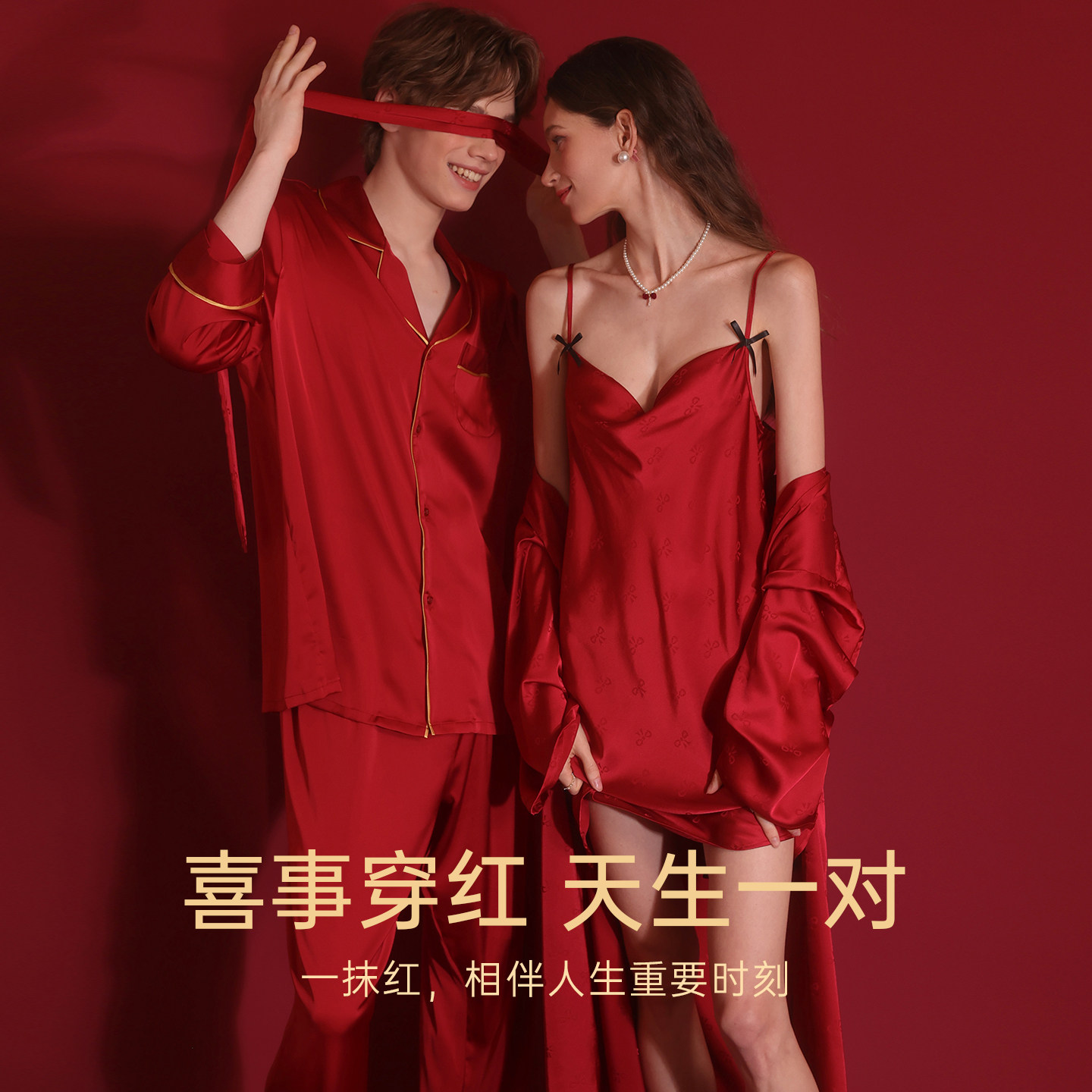 本命年红色冰丝睡裙女结婚新婚睡衣情侣装春秋季家居服男礼盒套装