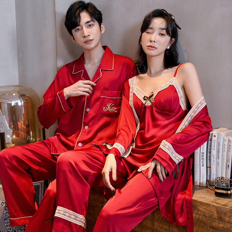 乐姿梦春秋季情侣结婚新婚睡衣女冰丝绸红色性感三件套男长袖套装