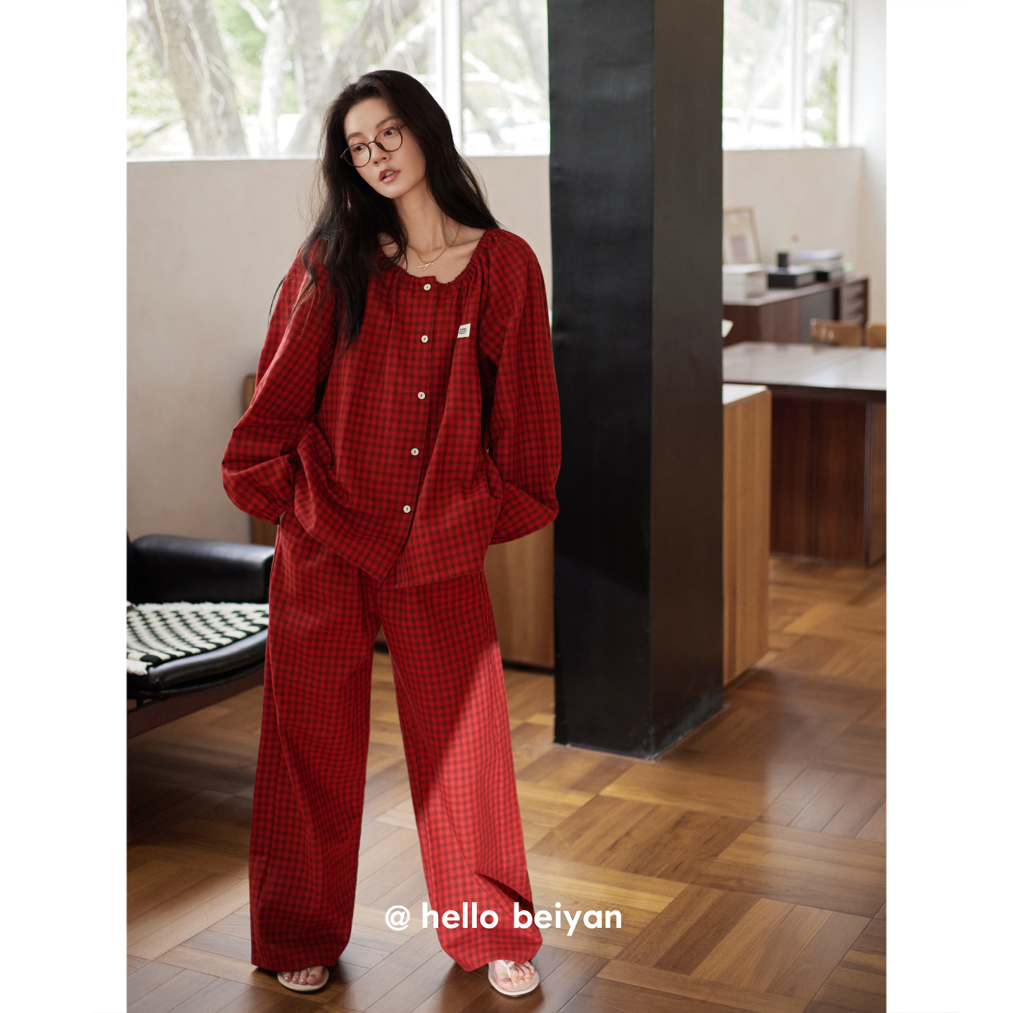 贝妍新婚睡衣女款春秋柔软长袖新年红家居服复古格子慵懒宽松套装