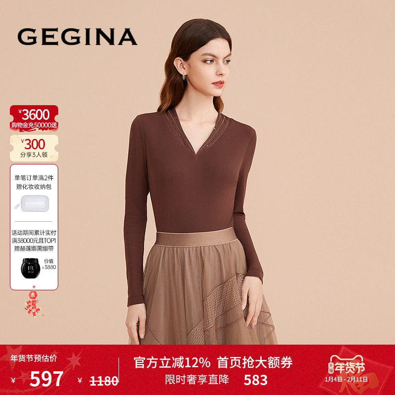 GEGINA吉吉娜女装V领纯色打底衫修身百搭高级感长袖T恤女商场同款